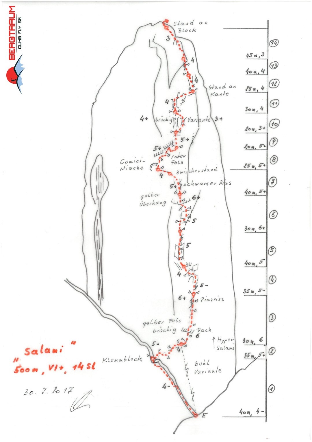 Zwei Anmerkungen zum Topo: nach der zweiten SL gerade mal zwei Meter nach rechts queren und dann gerade rauf zu einem markanten Riss (sieht aus, als wäre dort ein Blitz eingeschlagen…NICHT zum gelben Felsen rüber!). Nach der „Comici- Nische“ gerade für ca. 8 Meter rauf- der erste Haken ist erst unmittelbar sichtbar.
