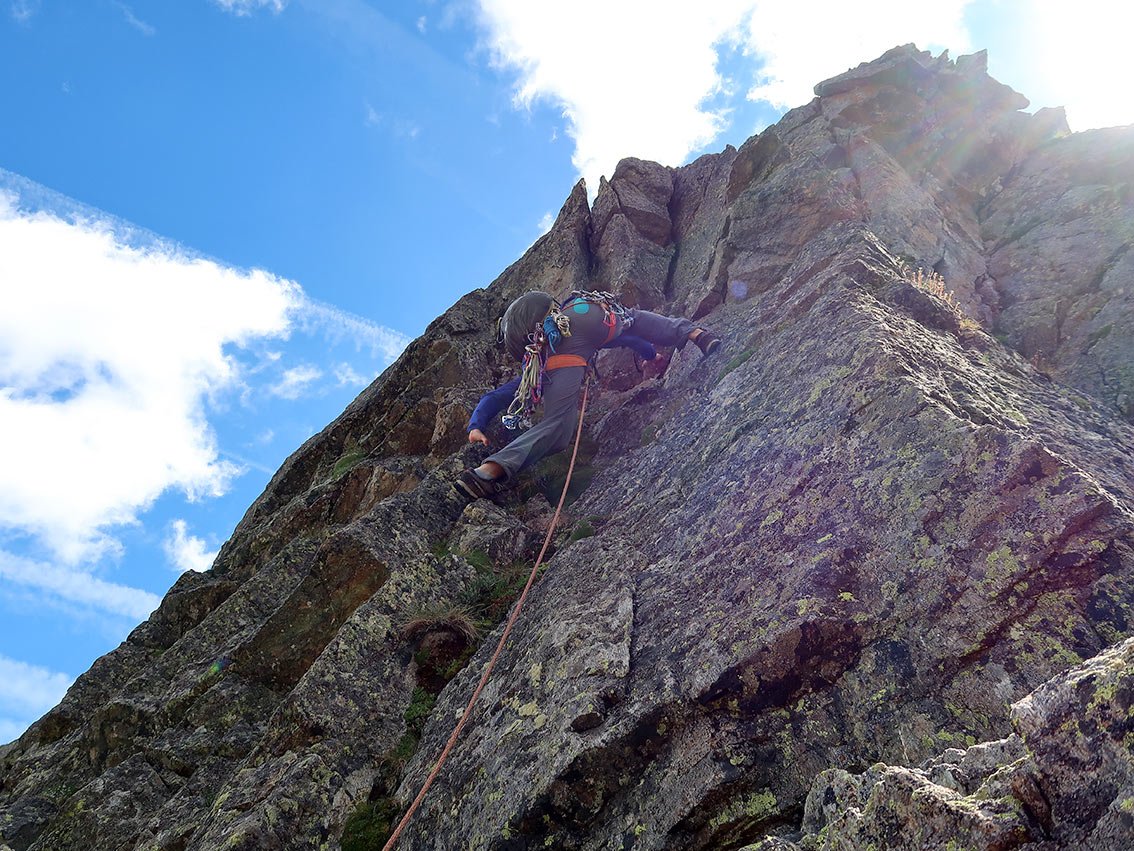 Nette Kurzroute in schöner, einsamer Umgebung. Geneigte Plattenkletterei in großteils gutem Granit, wie man ihn sonst in diesem Schwierigkeitsbereich nur selten findet. Die ersten drei Seillängen sind durchgehend im oberen dritten Schwierigkeitsgrad und sehr schön. Man würde sich mehr davon wünschen. Die letzten zwei Seillängen sind grasig, mit teilweise lockeren Blöcken – hier muss man vorsichtig sein. Wie im Granit üblich, ist der Fels mit Flechten bewachsen und die Tour bei Nässe unbedingt zu meiden! Der Gipfel der Sauspitze trägt ein Gipfelkreuz.