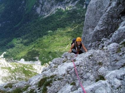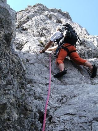 50 m Einfachseil, 8 Express, Bandschlingen und Helm! Feste Schuhe für den Abstieg.