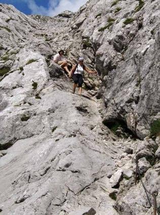 Alle Stände und einige Zwischenhaken gebohrt/geklebt. Für eine Alpintour ist die Route gut gesichert (im leichten Gelände aber etwas weitere Abstände).
