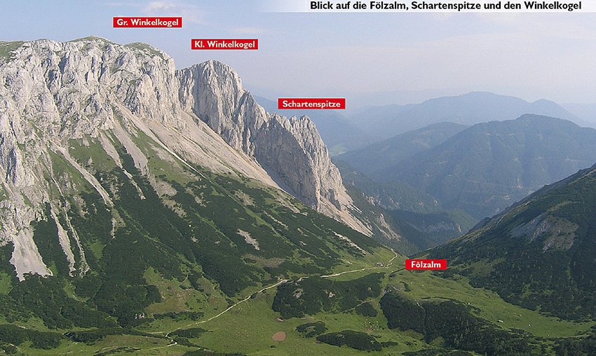 Auf der Gipfelwiese kurz nach Norden und dann in die Scharte zwischen Kleinen und Großen Winkelkogel. Dort auf einem Pfad in die Schlucht absteigen, bis man an der rechten Seite die erste Abseilstelle (15 m) erreicht. Danach kurz zu Fuß weiter, bis man auf der linken Seite noch 2 x 20 m abseilen muss. Unten auf einem Geröllweg zur Fölzalm gehen und auf dem Wanderweg zurück zum Parkplatz.