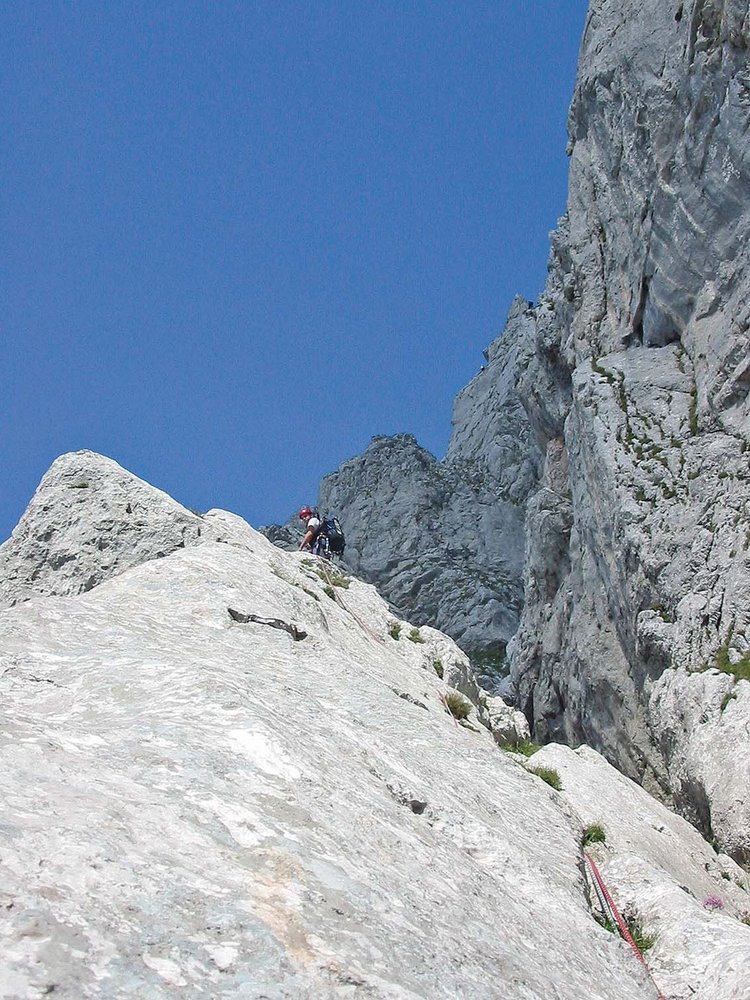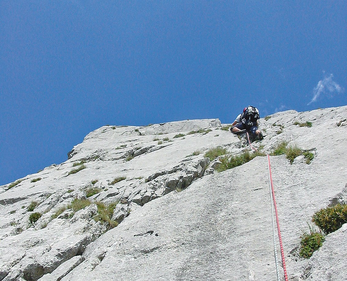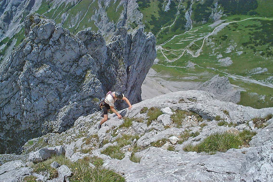 Diese großartige und lange Routenkombination - die nach dem Südgrat auch abgebrochen werden kann - zählt zu den am häufigsten begangenen Gratanstiegen bei der Fölzalm. Der Fels ist im unteren Teil der Routen teilweise brüchig, wird im oberen Teil aber besser. Man kann, ohne den Südgrat klettern zu müssen, durch die Nordschlucht zum Westgrat zusteigen. Die Kombination aus Südgrat und direktem Westgrat ist mit ca. 700 Klettermetern sehr lang. Der Mix aus schroffen Felswänden und den saftigen Almwiesen der Fölzalm ist landschaftlich sehr eindrucksvoll! Ein Abstecher zur Fölzalm lohnt sich auf jeden Fall. Mit etwas Glück kann man die Kletterer in den schweren Nordwandrouten beobachten.