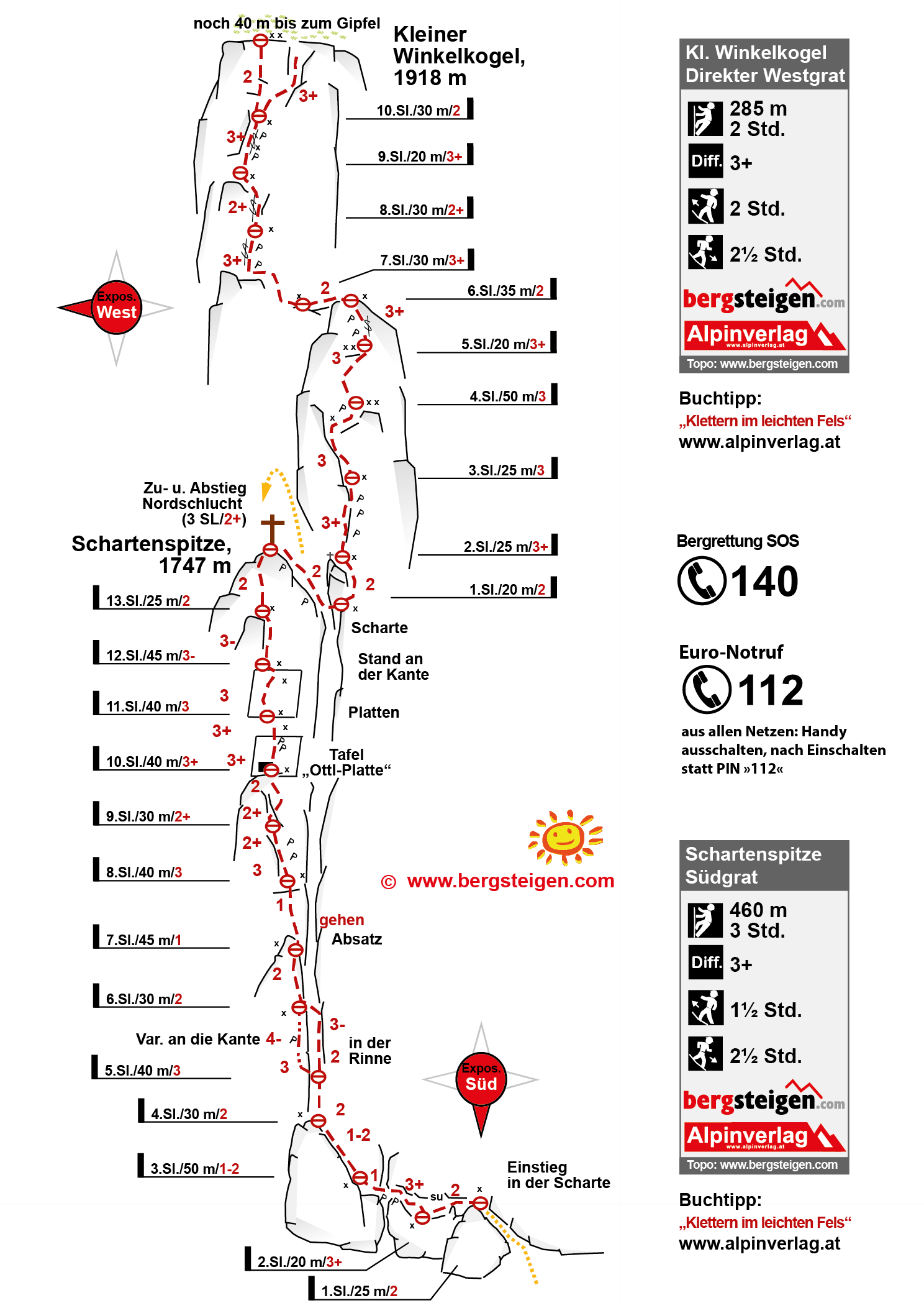 In den unteren Teilen ist meistens mit Steinschlag durch vorausgehende Seilschaften zu rechnen. Gesamt eine recht lange Klettertour! Man kann nach dem Südgrat die Tour abbrechen. In der Scharte zwischen Schartenspitze und Kleinen Winkelkogel klettert man in die Nordschlucht ab (heikel), es ist sicherer, wenn man dort 3 x 25 m abseilt!