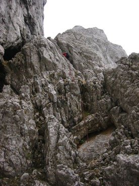 Vom Gipfel der Schartenspitze (nettes Gipfelkreuz) über stufiges Gelände in die Scharte zum Kleinen Winkelkogel absteigen (1-2). Hier befindet sich der Einstieg zum Kl. Winkelkogel Dir. Westgrat. Von hier aus links (nördlich) zum Geröllkar absteigen bzw./und über Haken und Schlingen abseilen. Dann über Zustieg zurück.