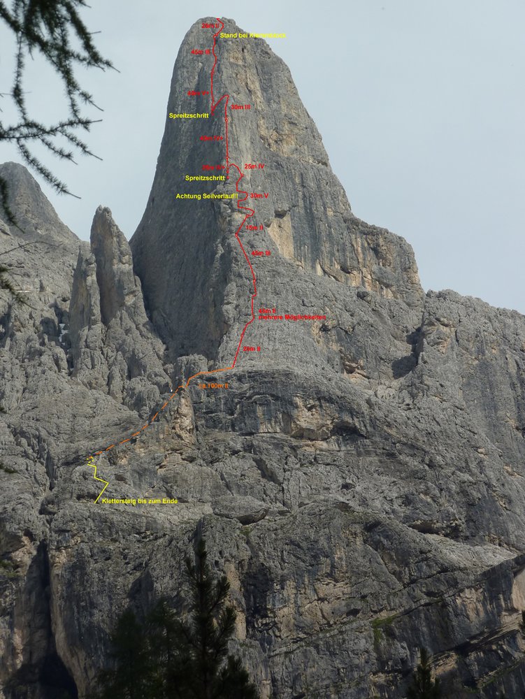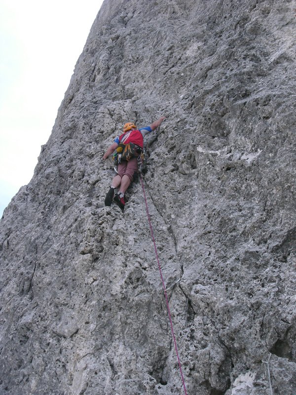 Großartige Kletterei in bestem Fels, die als eine der schönste Dolomitentouren gilt. Klassische Dolomitenkletterei an kompaktem Fels - im unteren Teil mehrere Möglichkeiten.