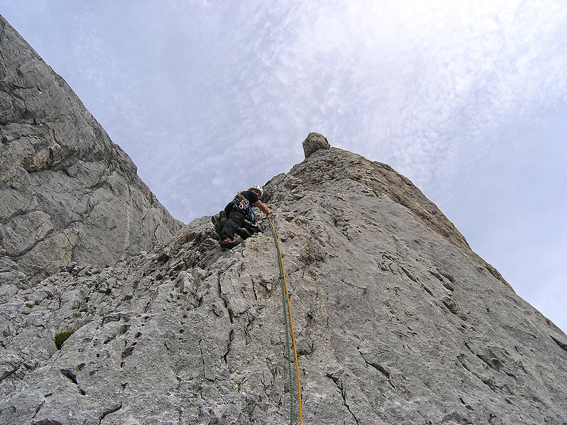 Die ersten vier Seillängen können nach längeren Regenfällen bzw. im Frühjahr noch nass sein. Es hält sich auch oft länger der Schnee in den schattigen Rinnen im unteren Teil der Tour. Absicherung besteht aus einzementierten Normalhaken und Bohrhaken am Stand.
