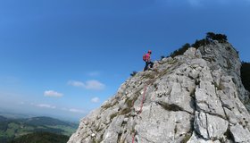 Die schweren Seillängen sind gut gesichert, der leichte und brüchige Grat hat keine Zwischensicherungen.