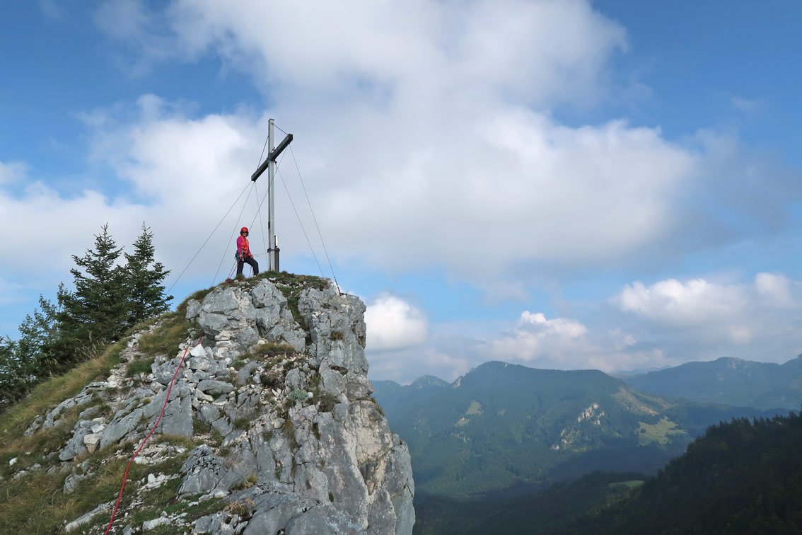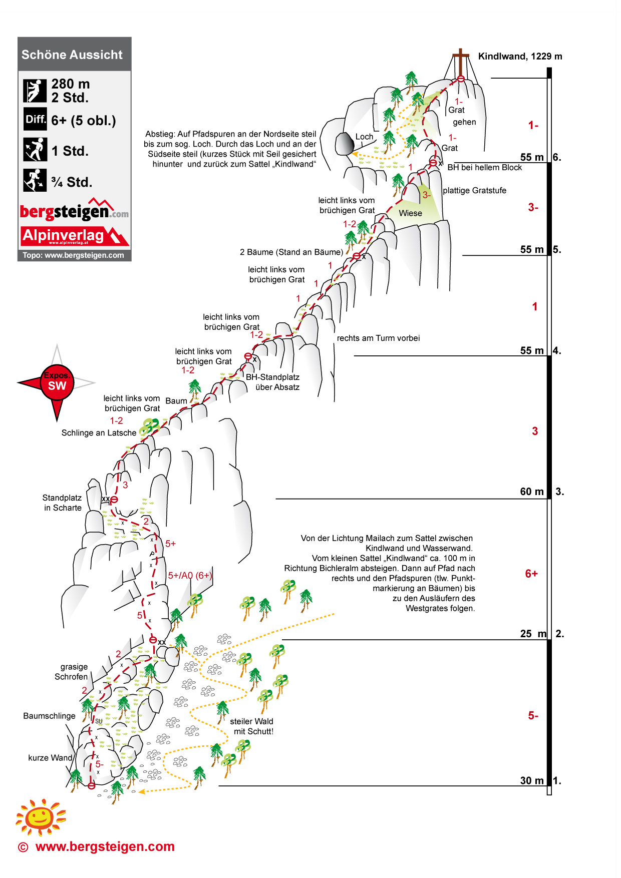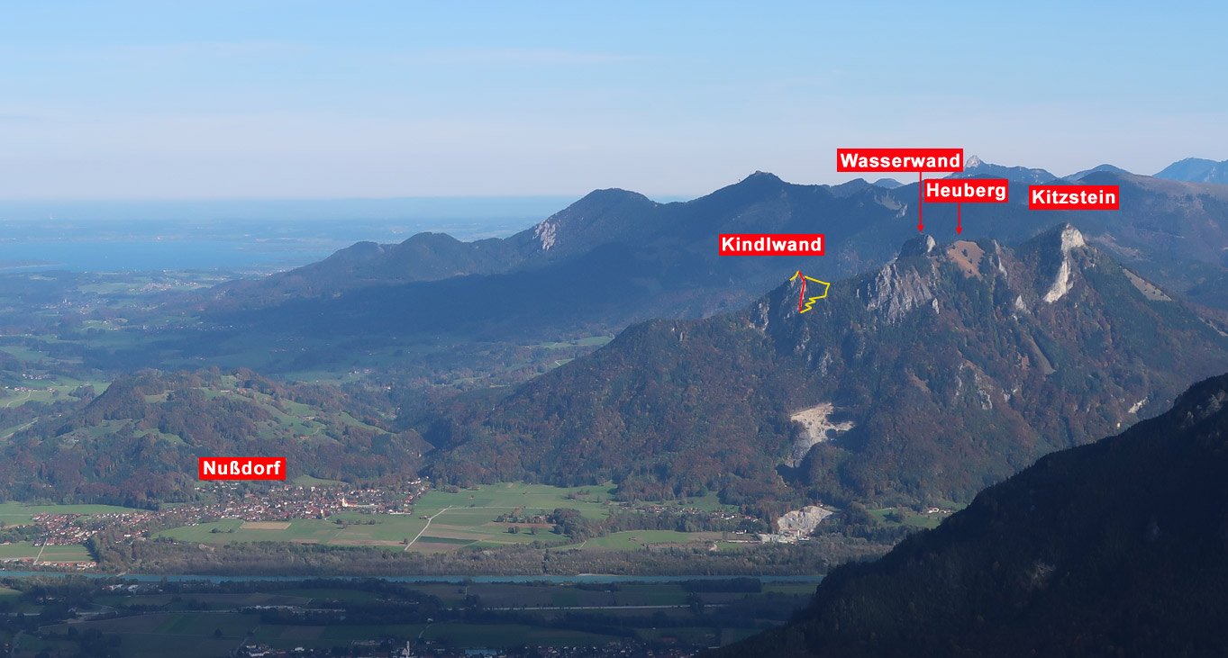 Der Westgrat auf die Kindlwand ist eine eher bescheidene Klettertour, wegen dieser Tour muss man nicht unbedingt dort hinauf. Im Gesamtpaket - gute Auffahrt mit dem MTB von Nußdorf, Rundwanderung vorbei an Heuberg und Wasserwand (die Gipfel kann man leicht mitnehmen) zur Kindlwand. Nach dem Westgrat dann der originelle Abstieg durch das "Loch" und gemütliche Einkehr bei der Daffneralm - in dieser Kombination als Tagesunternehmung aber sehr lohnend.