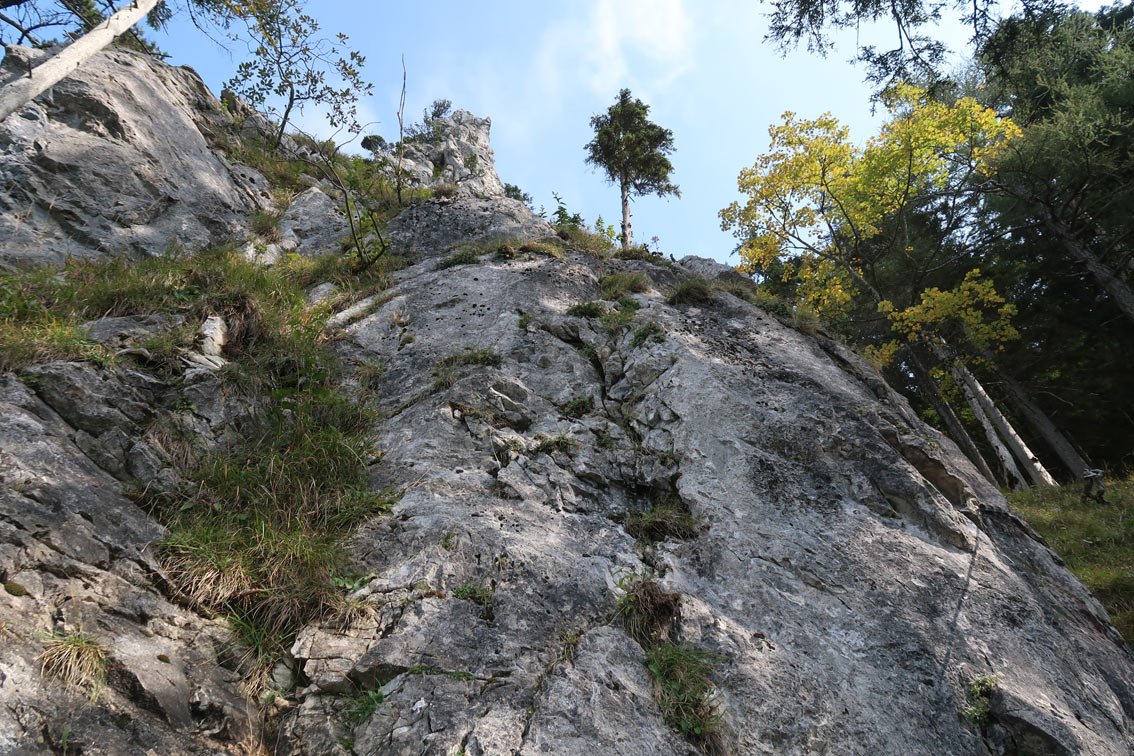 Vom Gipfel der Kindlwand auf dem Pfad kurz steil nordseitig absteigen, dann nach rechts zum sog. Loch queren. Durch den Berg auf die Südseite und steil hinunter (kurze Felsstufe, ist mit einem Kletterseil gesichert) absteigen. Dann durch den Wald zurück zum Sattel "Kindlwand" und von diesem auf dem Zustiegsweg zurück zum Ausgangspunkt.