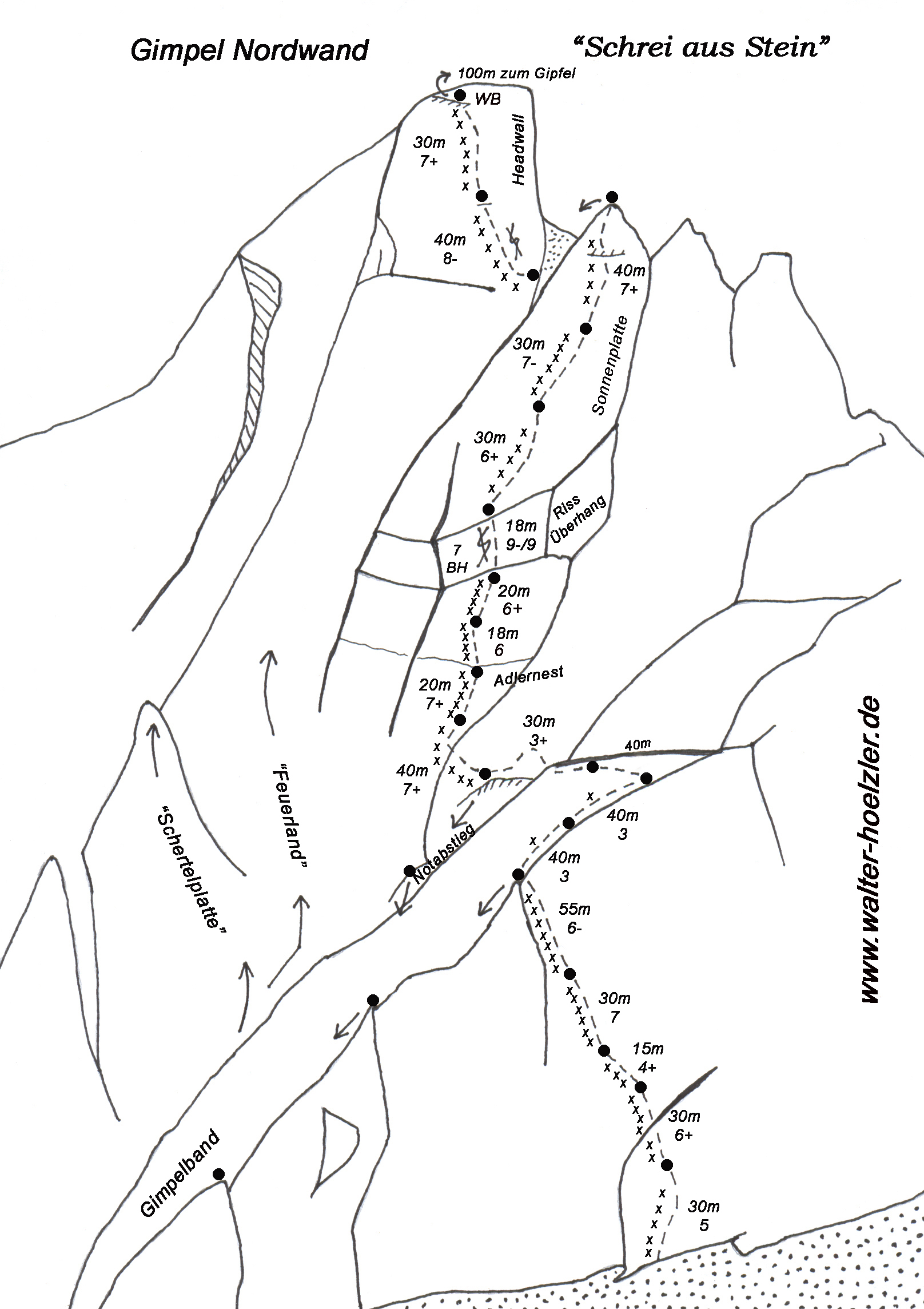 "Schrei aus Stein“; Kletterlänge vom Wandfuß ca. 650 Meter bis zum Ausstieg; 750 bis zum Gipfel; Schwierigkeitsvorschlag 9-/9 im Rotpunktdurchstieg (8- obl.). Rest siehe Topo.