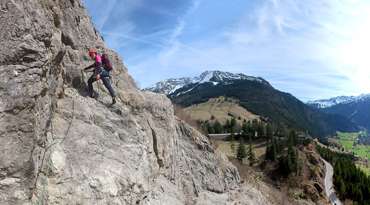 Vom Parkplatz P1 in Oberjoch (beim Kreisverkehr, dort ist auch die Touristeninformation) folgt man der Straße in Richtung Bad Hindelang, zweigt aber dann auf einen Schotterweg links der stark befahrenen Straße ab und erreicht so die Kanzelkehre. Dort über die Straße und vor dem Zugang zum Aussichtspunkt (kleiner Kiosk) steil im Wald den Hang hinunter (Beschilderung Klettersteig). Unten entlang vom Fangnetz bis zu dessen Ende. Hinter dem Fangnetz kurz etwas nach rechts, dann aber durch die Büsche zur Wand und über den Schutt hinauf zum Einstieg (Tafel mit Routennamen)..