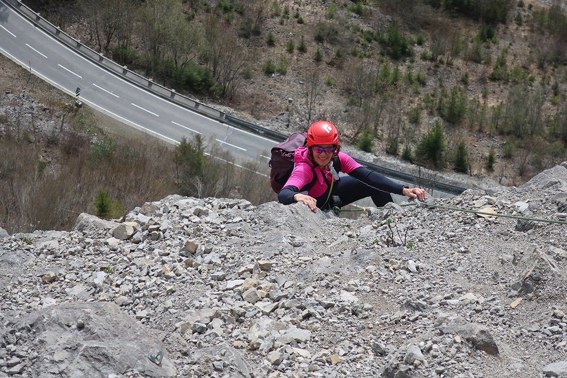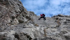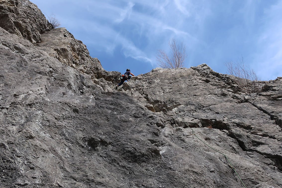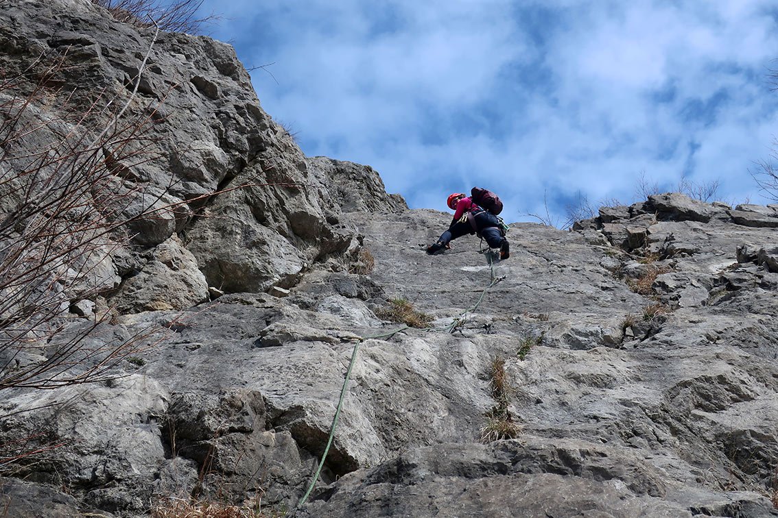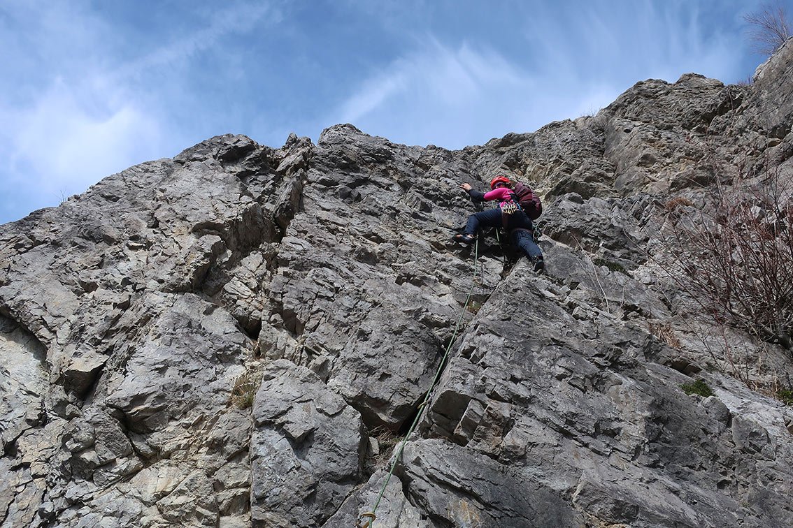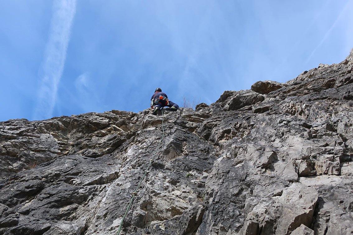 Die Route Schuppentest ist evtl. die Route, in der man am meisten auf die Festigkeit der Griffe aufpassen muss. Es gibt aber auch festen Fels- und den muss man Festhalten - und recht schöne Kletterpassagen. Die Tour kann gut mit anderen Touren an der Wand kombiniert werden (nicht vergessen schnell zu klettern und die Parkscheibe nach zustellen). Wie bei den anderen Touren eher Trainingstour-Charakter, bei dem man einen schönen Blick in die nördliche Bergwelt hat.