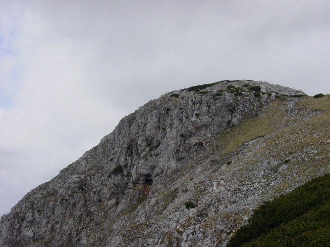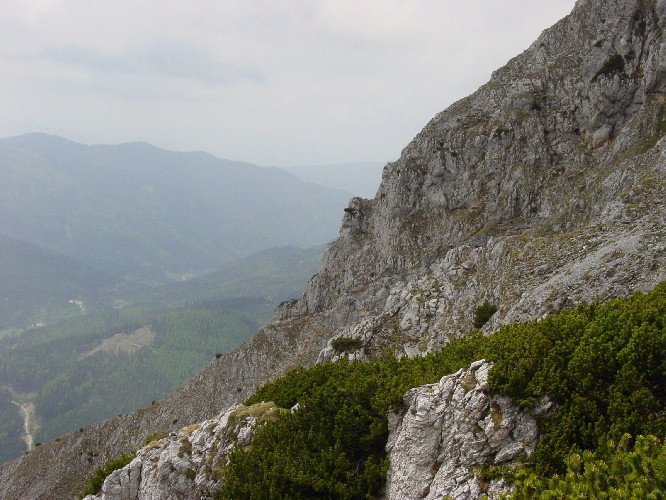 Die breite, rötliche Rinne wird bis in eine kleine Scharte ersteigen, man erreicht somit den Schwarzlochgrat. Der nächste Turm wird von rechts erstiegen (I +) und dann am Grat in einen kleinen Sattel mit Latschen fast waagrecht weiter verfolgt. Nun sehr mühsam am Latschen verwachsenen Kamm weiter hinauf, zwei Felsstellen (I-) unterbrechen die Latschen, doch plötzlich steht man auf einer langen, leicht ansteigenden, Rasen durchsetzen Felsschneide. Herrlicher Blick in eine fast unberührte Rax Landschaft. Die Felsschneide (I - und Gehgelände) wird bis zu ihrem Ende verfolgt, wo sich der Grat steil auftürmt. Dieser steile turmartige Aufbau wird rechts in einer kleinen Rinne mit einer senkrechten Stelle (II -) erstiegen. Man erreicht so eine kurze, waagrechte Felsschneide. Diese wird überschritten und dann immer der Grat direkt bis zur Hochfläche weiter verfolgt (zunächst I +, dann I -).