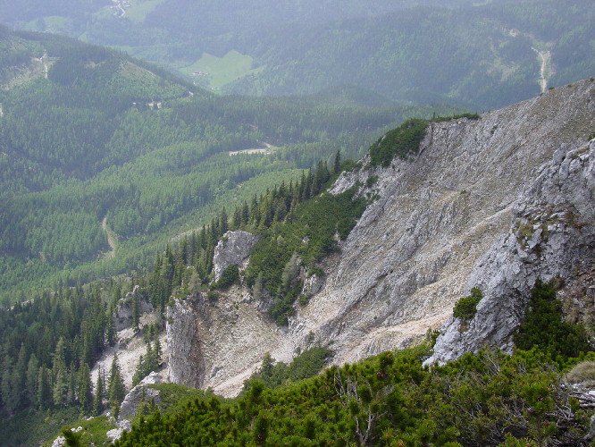 Vom großen Schuttfeld verfolgt man den oberen Jagdsteig nach links zu einem deutlichen Riegel. Hinter diesem Riegel führt eine kaum sichtbare Steigspur hinab zum unteren Jagdsteig, der weiter nach links verfolgt wird. Auf einem Riegel befindet sich ein kleiner Forststand, der nochmals einen guten Rückblick zum Schwarzlochgrat bietet. Links hinter dem Riegel führt ein schmaler, aber deutlich sichtbarer Steig nach Querung einer Schuttrinne in vielen Kehren einen breiten Rücken abwärts – tolle Sicht auf einen Felsabbruch mit markantem Turm. Weiter unten leitet der Jagdsteig nach rechts und quert die Schuttrinne, man bleibt aber auf dem Rücken links der Schuttrinne und steigt diesen durch steilen Buchenwald ab und verfolgt ihn bis zum Schwarzkogel. Vom Sattel vor dem Schwarzkogel nach links zu Jagdhütten und drei Kehren der Forststraße, bis ein Karrenweg nach links rückwärts abzweigt. Dieser Karrenweg leitet neben deutlichen Wildbachrinnen mit kleinen Wehren abwärts und schließlich zu einer Forststraße. Von hier folgt man den Wegmarkierungen nach Großau.