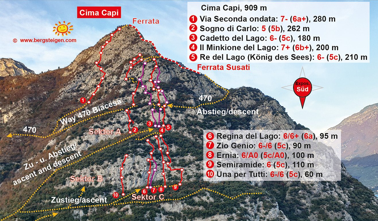 Die Seconda ondata ist eine von den Erstbegehern wirklich gut gefundene Linie an der Südwestseite der Cima Capi. Die Route verläuft über Platten, Plattenrampen und im oberen Teil an steilen, teilweise plattigen Aufschwüngen bis fast hinauf zur Ferrata Susatti. Gesamt ein schönes, längeres Kletterabenteuer mit abwechslungsreicher Kletterei und perfektem Blick auf den Gardasee!