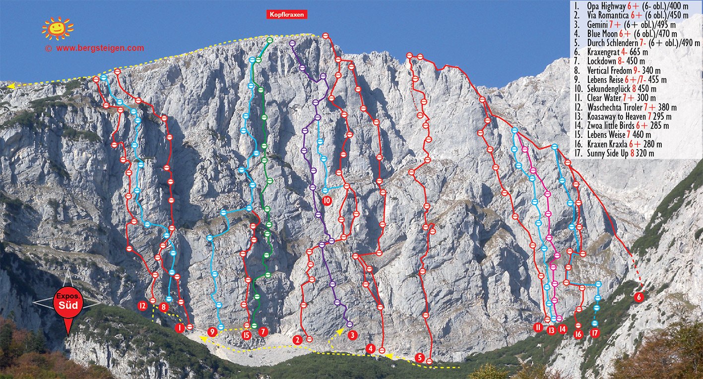 Die Route "Sekundenglück" folgt einem spektakulären teils überhängenden Riss durch einen glatten Pfeiler mitten in der Kopfkraxen Südwand. Die eigentliche Route ist zwar nicht besonders lang aber dafür vom ersten bis zum letzten Meter extrem lohnend! Der Fels ist von bester Qualität und die Kletterei lässt jedes Kletterherz höher schlagen!