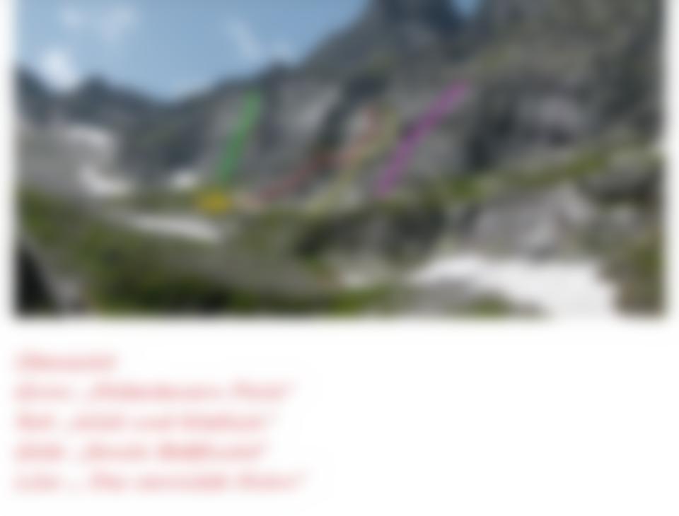 Wandfuß. Oder links den Wanderweg weiter und oberhalb der Steilstufe zur Wand queren. Einstieg: In der Falllinie der markanten grünen Platte (NH mit Schlinge).
