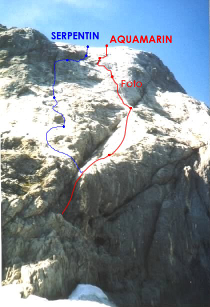 Über die Route Aquamarin abseilen. Doppelseil notwendig!!! Weiter über Zustieg absteigen.