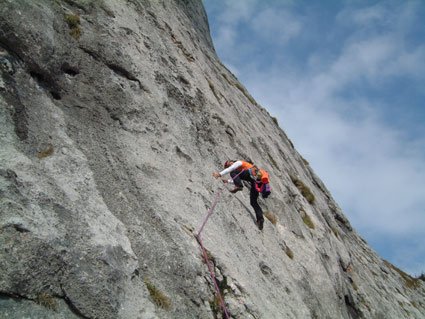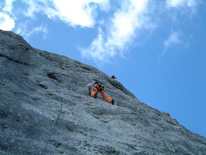 Ausgesprochen schöne Kletterei an wasserzerfressenem, rauhem, festem (mit kleinen Ausnahmen im oberen Teil, die jedoch nicht stören) und mit vielen Löchern durchsetztem Fels. Grossteils handelt es sich um Plattenkletterei von unterschiedlicher Neigung, die von kurzen Rissstellen unterbrochen wird. Nach Regen bis auf wenige Meter schnell trocken. In der 2. Sl. wird die Route "Weder Blau Noch Sand" (VI+) gekreuzt - rechts halten; in der 6. Sl. Fluchtweg (Bh) zu "W. B. N. S." nach links, "Sesam Öffne Dich" zieht nach rechts. Die Tour ist durchgehend mit Bohrhaken sehr gut gesichert. Der 7te Grad sollte geklettert werden können, um Spass an der Tour zu haben.