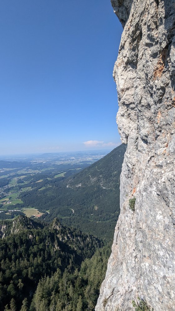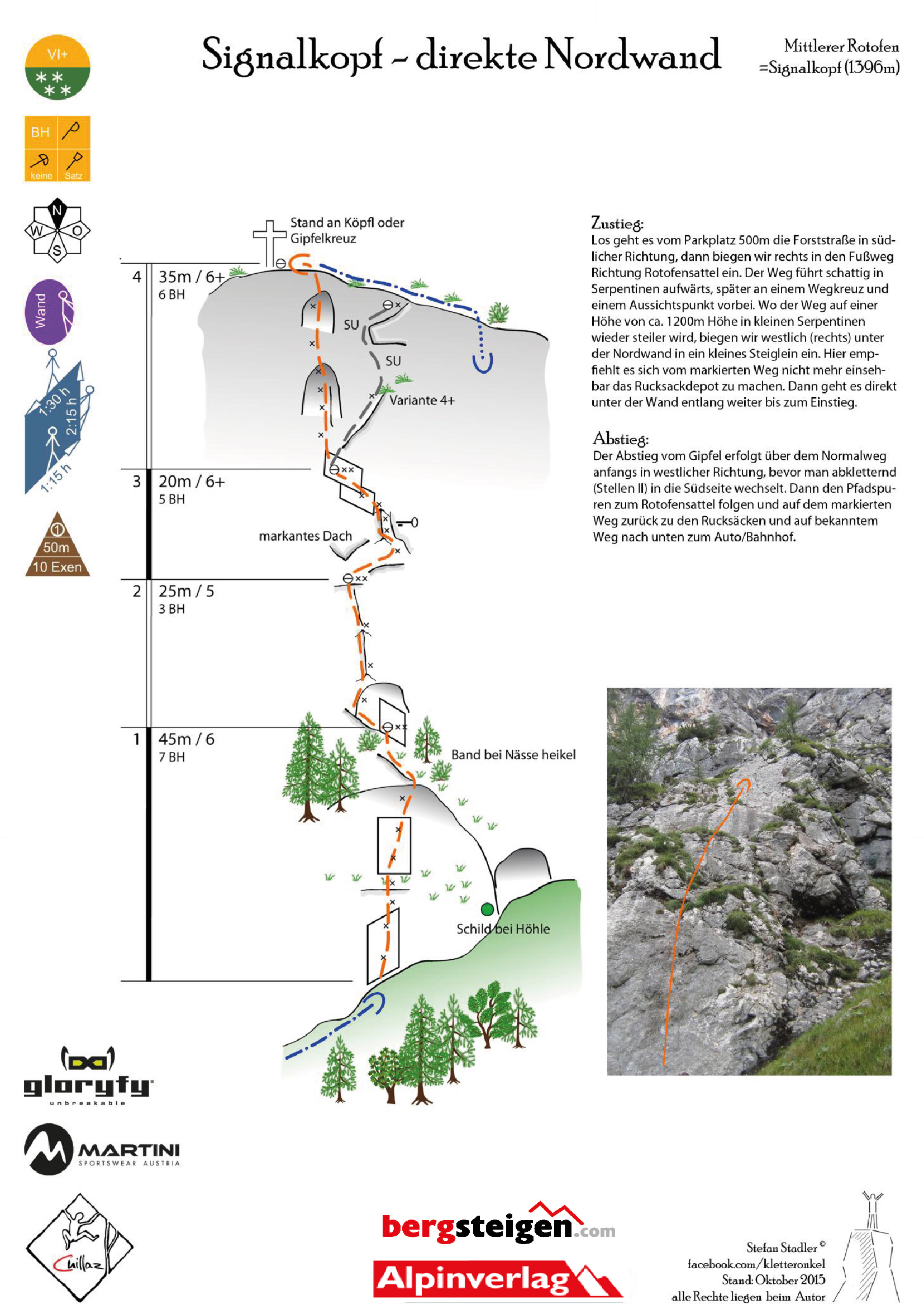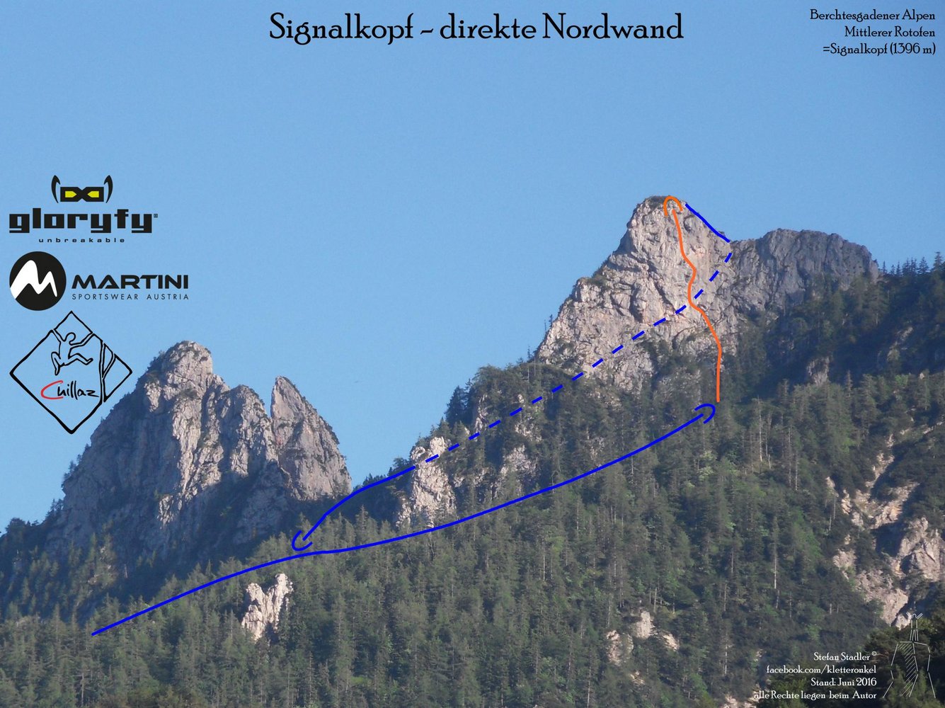 Die Genussklettertour auf den Mittleren Rotofen (so wird der Signalkopf auch genannt) ist mit 4 Seillängen nicht besonders lang, der Zustieg in einer Stunde machbar. Eine alpine Mehrseillängenroute, die an einem halben Tag gut gemacht werden kann. Die Aussicht auf die Chiemgauer Alpen (Hochstaufen, Zwiesel…) ist während der gesamten Tour sehr schön!