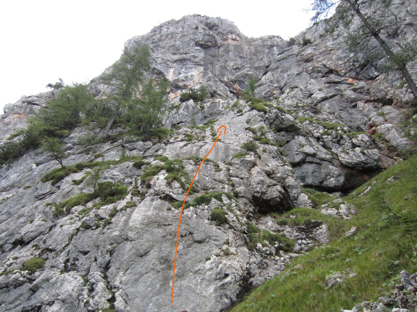 Siehe Topo. In der letzten Seillänge ist rechts eine Variante möglich.