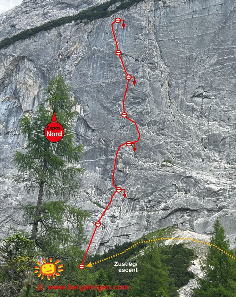 Vom Parkplatz Schraffelbrücke in Scharnitz mit dem Fahrrad 13 km bis in den Talboden der Kastenalm. Ca. 100 Meter vor dem Kastenalm Parkplatz links durch ein Gatter und in 5 Min. mit dem Rad bis unter die Wand. Danach noch rechts unterhalb der Wand den Steinmännern 10 Min. bis zum Einstieg folgen.