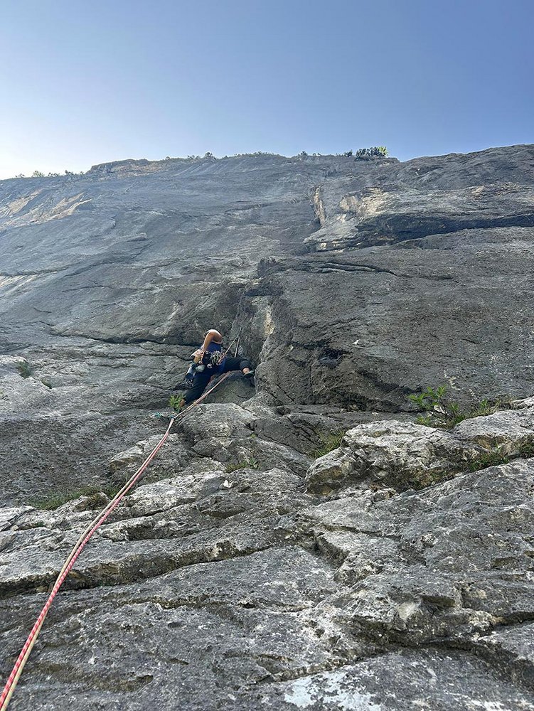 Die Tour ist gut mit Bohrhaken abgesichert, mobile Sicherungsmittel braucht man nicht. In den leichten Passagen ist sie teilweise etwas weiter gesichert. Der Haken kommt immer da, wenn man sich gerade einen wünscht.