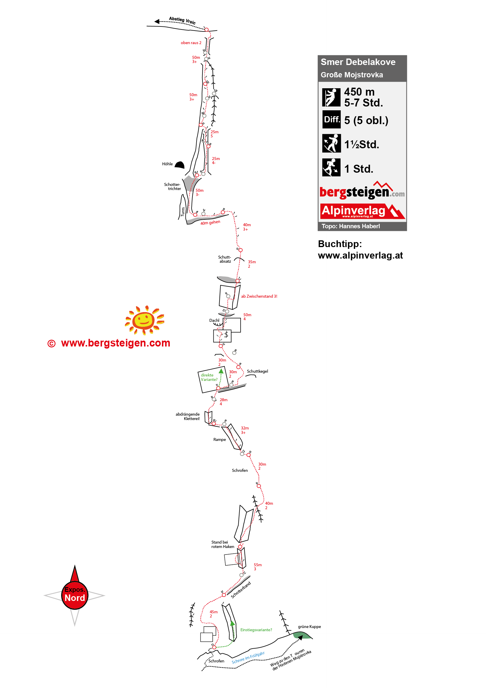Vom Parkplatz am Vrsic (1611m) auf dem Weg Richtung Sleme. Am Törl (Vratca, 1807m) nimmt man den rechten Weg Richtung Sleme. Bei der nächsten Weggabelung nach links Richtung Slatnica (Sattel zwischen kleiner Mojstrovka und Sleme, 1815m). Vom Sattel steigt man nach links ab zum Wandfuß. Hier setzt ein alter Jägersteig steil an einer grasigen Rampe an (Wegspuren sichtbar). Auf dem grasigen und schottrigen Steig, teils sehr exponiert, weiter. Man gelangt so an den Wandfuß der großen Mojstrovka, eine Art Schotterkar. Man quert das Schotterkar und gelangt auf so auf die Rampe, die auf den grünen Kopf führt. Einstieg etwa mittig der Rampe. Man klettert eine Art Vorbau hinauf (Stand mit 2 Haken und Reepschnur).