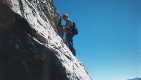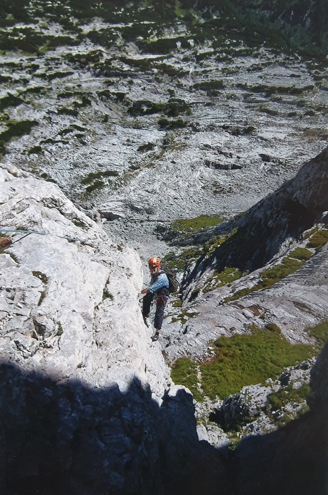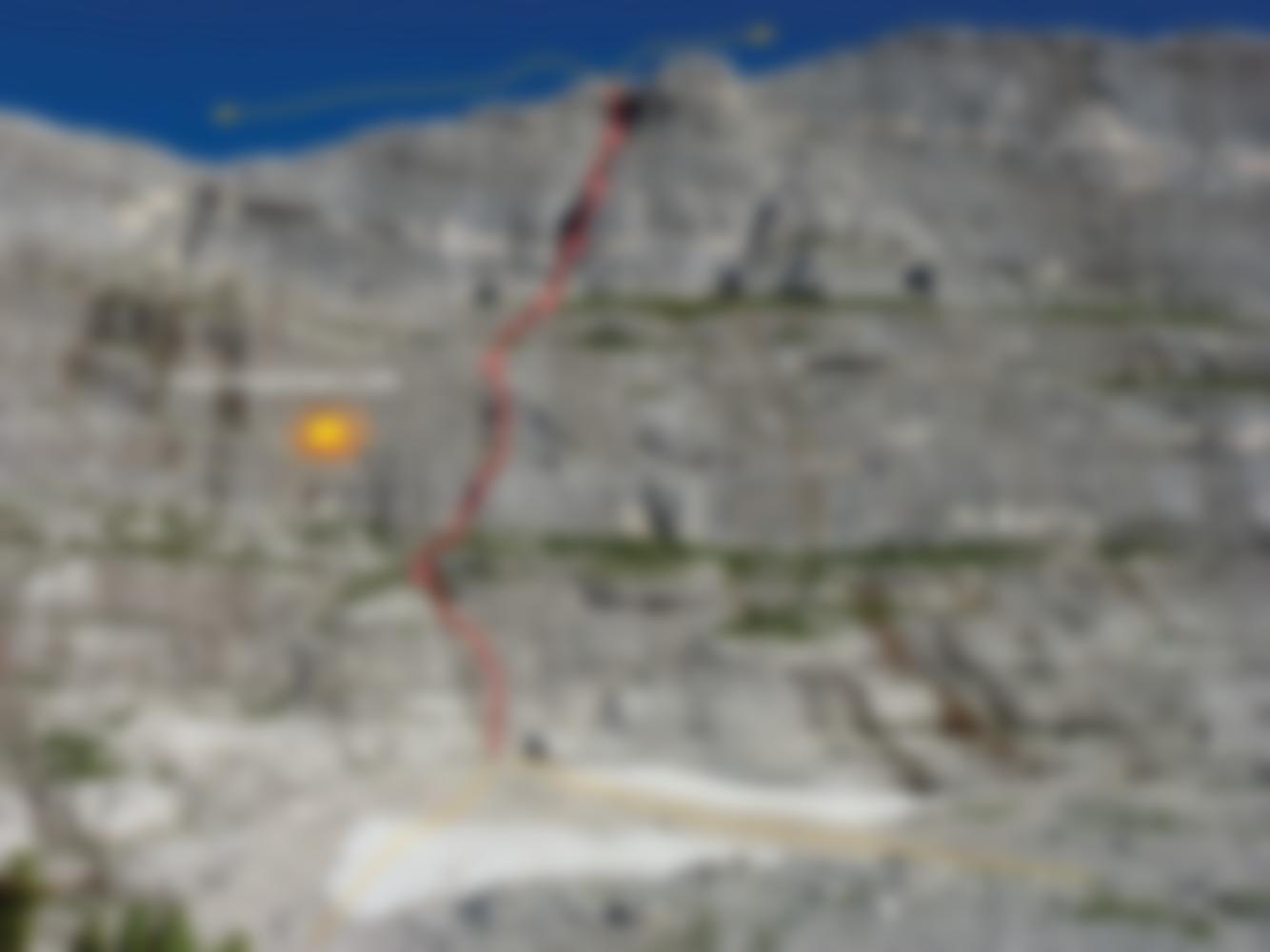 Alpine Route in beeindruckender Landschaft. Einige grasige Bänder aber viele schöne Klettermeter, meist guter Fels. Alle nötigen Hake wurden von de Erstbegehern belassen. Die Absicherung wurde 2016 verbessert ( 5 neue Bohrhaken). Ganztägig Sonne, nach längerem Regen aber etwas zuwarten. Rechts vom Einsiteg meist Wasserstelle.