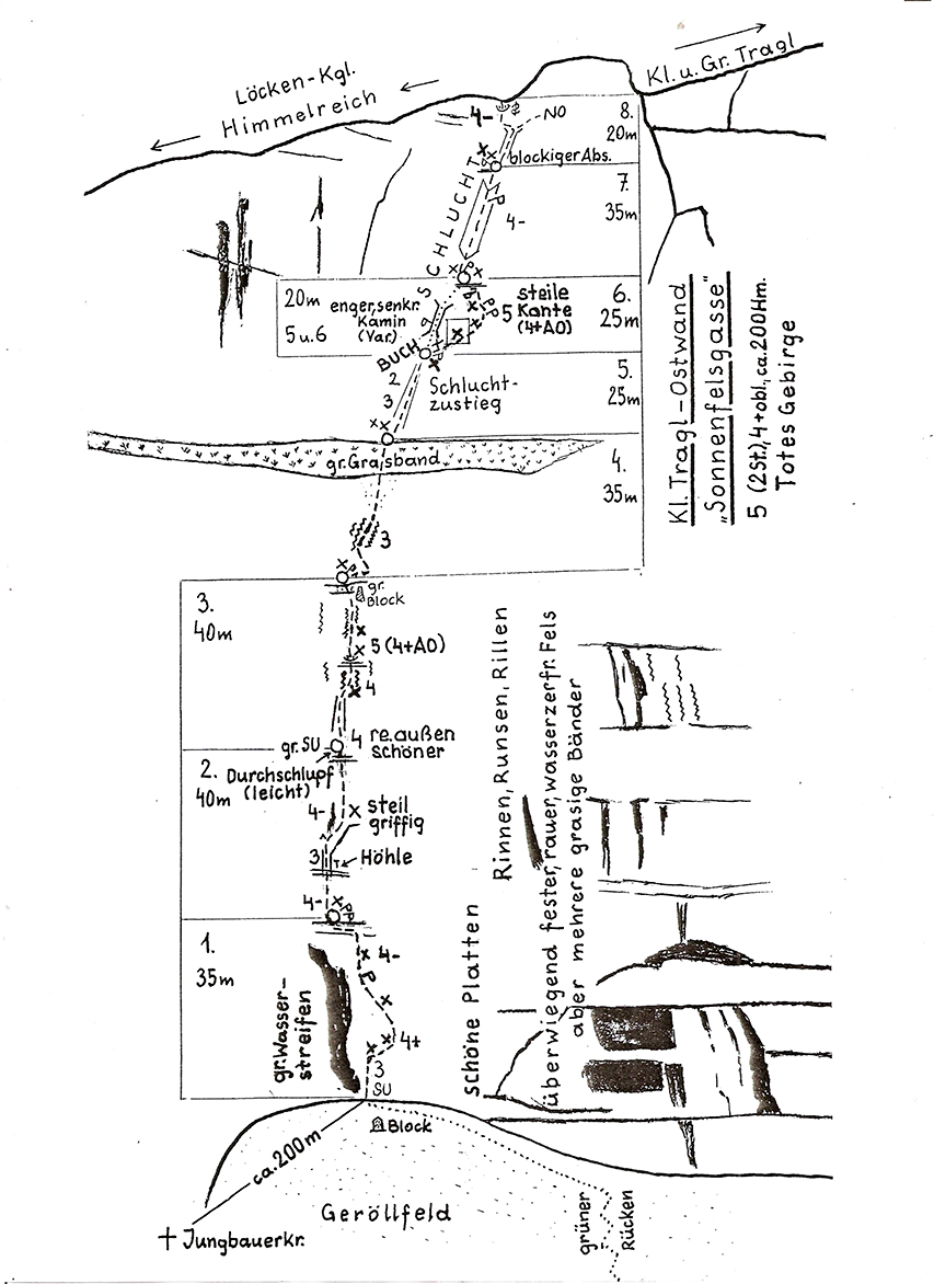 Schwieriger und kürzer (- 30 Min.): Vom Ausstieg nach links bis zum Himmelsreich und dort links der Tour auf dem „Abstiegsweg“ abklettern (Stellen 1-2), über eine kurze Stufe (ca. 15 m) muss abgeseilt werden (siehe Topo). Alternativ kann man rechts zum Großen Tragl aufsteigen und vom Gipfel auf dem Wanderweg absteigen (man kommt am Einstieg vorbei). Anmerkung: Die meisten Kletterer steigen noch kurz auf den Löckenkogel und dann neben der Route auf dem „Abstiegsweg“ ab. Details siehe Topo bei der Route Himmelsreich!