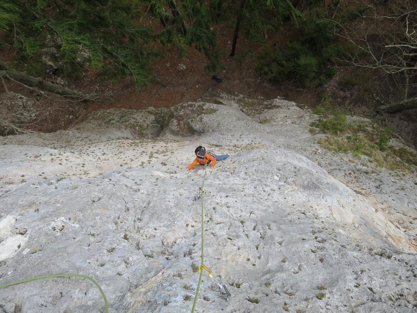 Links auf der Straße etwas bergab, nach ca. 100 m beginnt rechts ein kleiner Steig, der zu einem einzeln stehenden, großen Felszacken hinaufführt. An diesem entweder rechts vorbei, eine steile erdige Rinne hinauf zu einem Felsspalt und durch diesen hindurch oder unter dem Felszacken links vorbei und dahinter steil hinauf in einen kleinen Waldsattel und weiter zur Wand.