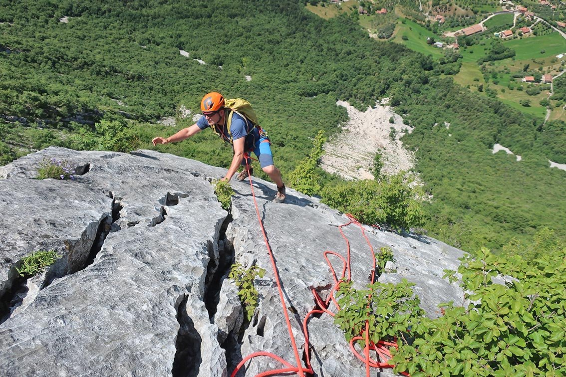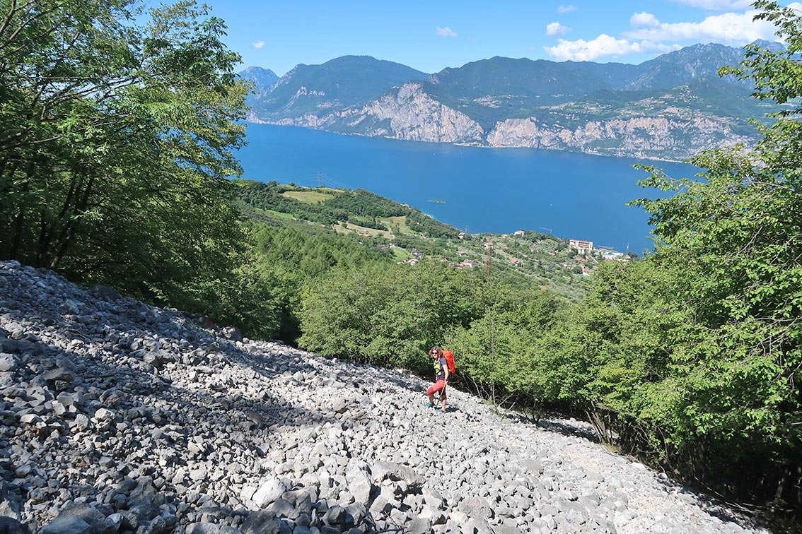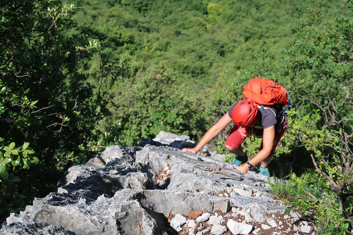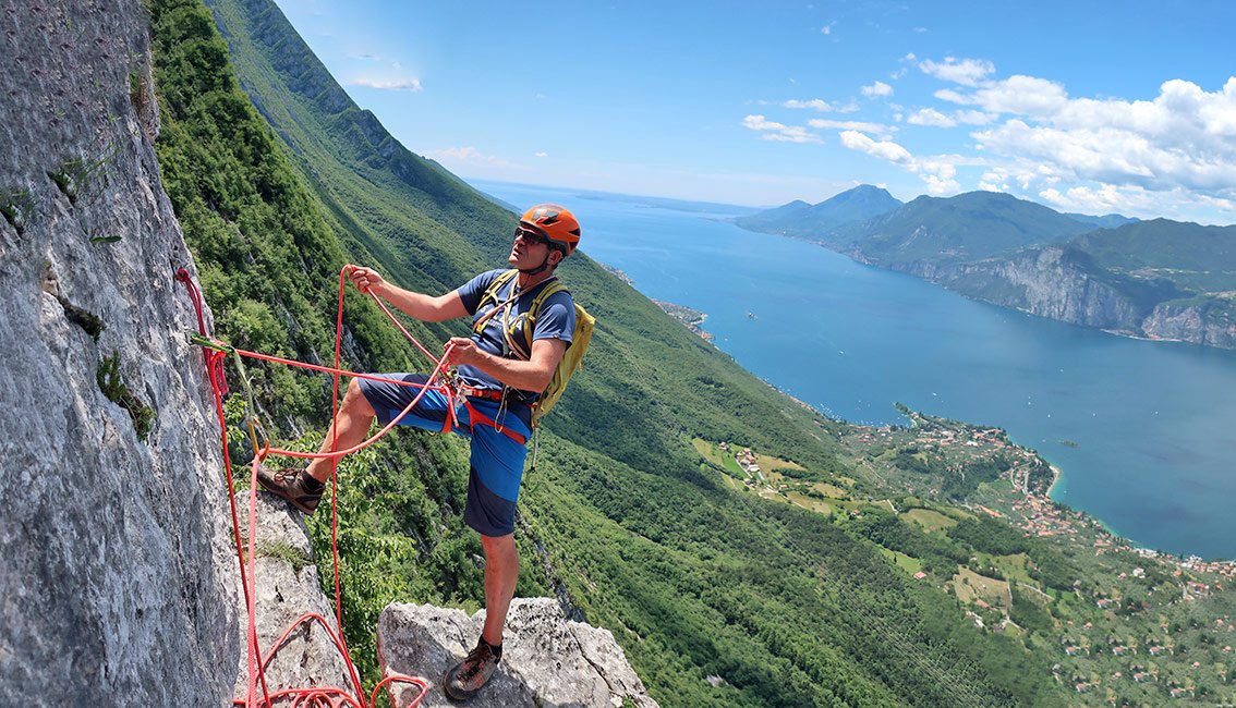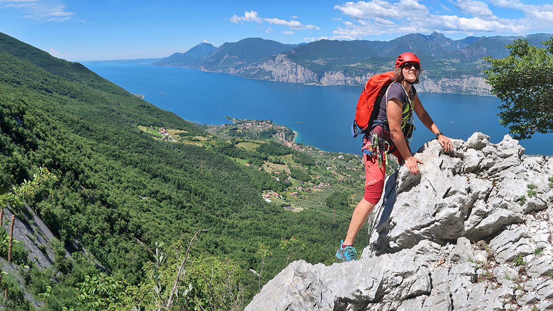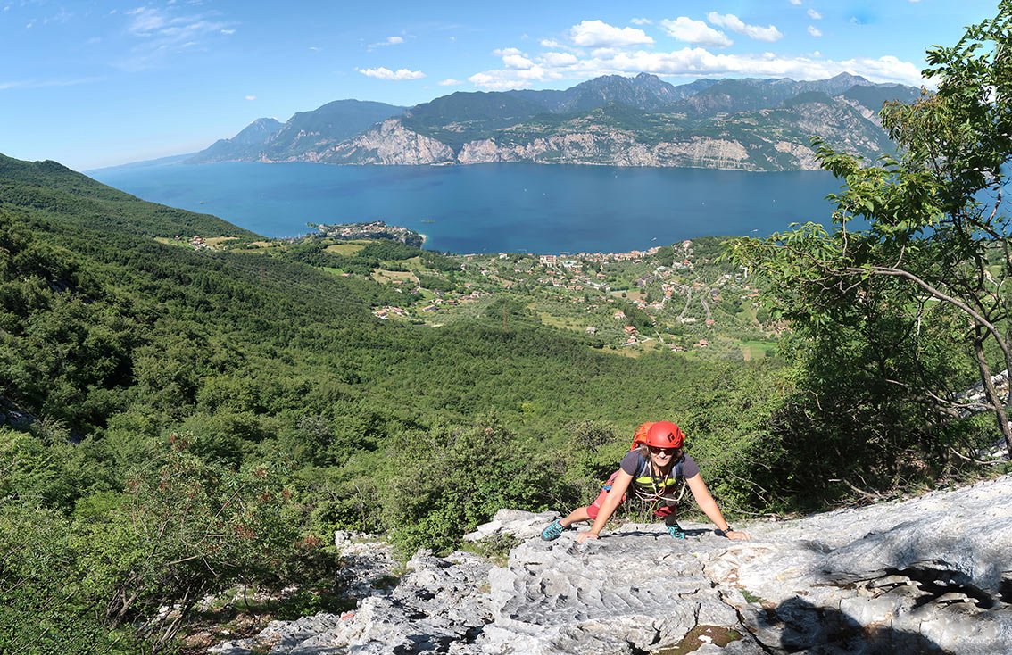 Spigolo Bianco – weiße Kante – dieser Name klingt doch toll und wenn das ganz noch oberhalb der tiefblauen Fluten des Gardasees ist, kann man die Tour eigentlich gar nicht mehr topen. Und wirklich, dieser Gratanstieg hat Klasse! Unten geht es an extrem vom Wasser zerfressenen Fels aufwärts – quasi jeder Griff ist eine Sanduhr. Als Finale folgen dann noch 3 Seillängen anregende Kletterei, die man dank der guten Bohrhakenabsicherung auch mit Zustiegsschuhen stresslos schafft. Beim Abstieg – bei dem man zuerst aber noch 150 Hm aufsteigen muss – klettert man durch eine kleine Höhle, um dann den Aufstieg auf der Wiese beim Col dei Piombi zu beenden. Gesamt ein wirklich tolles Kletterabenteuer, das einen sehr schönen Kontrast zu den Felswänden rund um Arco verspricht – klettern direkt oberhalb des Gardasee, das hat einfach was.