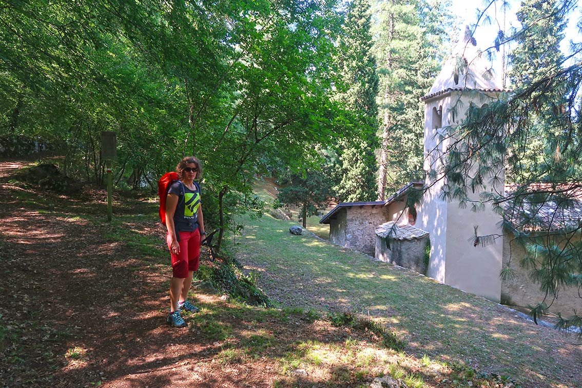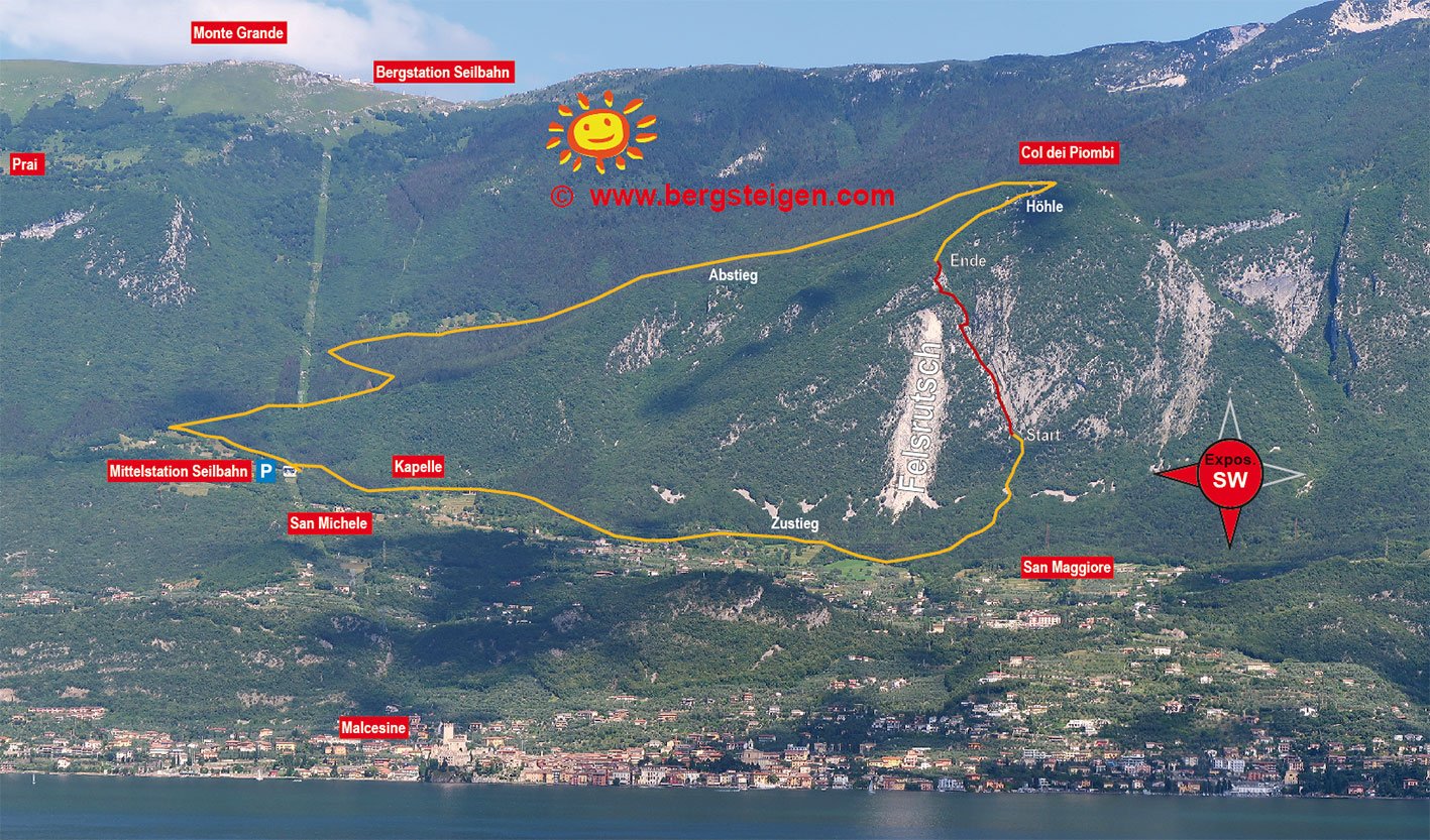 Von der Mittelstation kurz gerade bergauf, nach ein paar Metern aber rechts zur Kapelle San Michele/San Maggiore abzweigen. Man folgt dem Wanderweg Nr. 13 durch den Wald abwärts (alternativ auch dem Fit-Parcour, der stößt unten wieder auf den Wanderweg Nr. 13). Wenn man aus dem Wald kommt, steht rechts ein Haus in der Freifläche, man bleibt auf dem Wanderweg (die Betonstraße vom Haus fällt rechts zum Ort ab). Es kommt etwas Buschwald, dann wieder eine Wiese rechts vom Weg. Kurz danach verlässt man den Wanderweg (vor dem Sperrzaun oder kurz danach) auf deutlich rot markiertem Pfad. Man folgt diesem Pfad, Buschwald, dann über ein kurzes Schuttfeld und am Ende in einem Bachbett hinauf zum Einstieg (immer auf die rote Markierung achten). Der Einstieg ist bei einem Baum (Schlinge, rote Punkte).