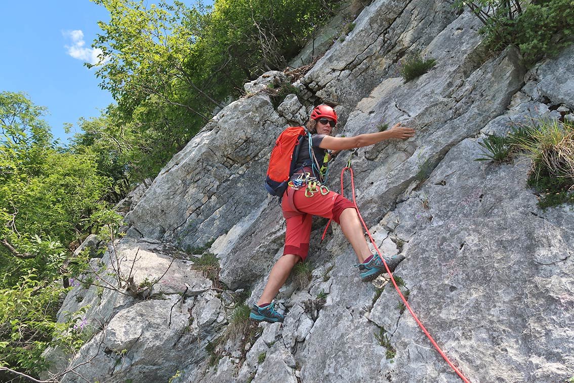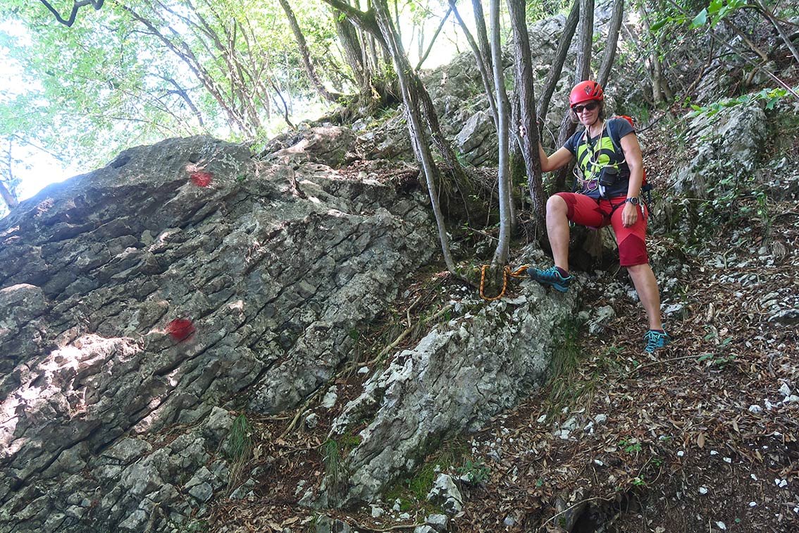 Siehe Topo: Anfangs steiles Gehen, dann bei Pfeil nach rechts zum Grat. Jetzt lange auf dem Grat (Stellen bis 2+), oben quert man einmal bei rotem Pfeil nach rechts (Bohrhaken) parallel zum Grat. Nach diesem erreicht man einen flachen Rücken, dort links (Schlingen an Bäumen und rote Punkte) über eine Stufe zum Standplatz (2 Bohrhaken) an der Schlusswand. Dort jetzt noch 3 Seillängen wie im Topo bis zum Ende.