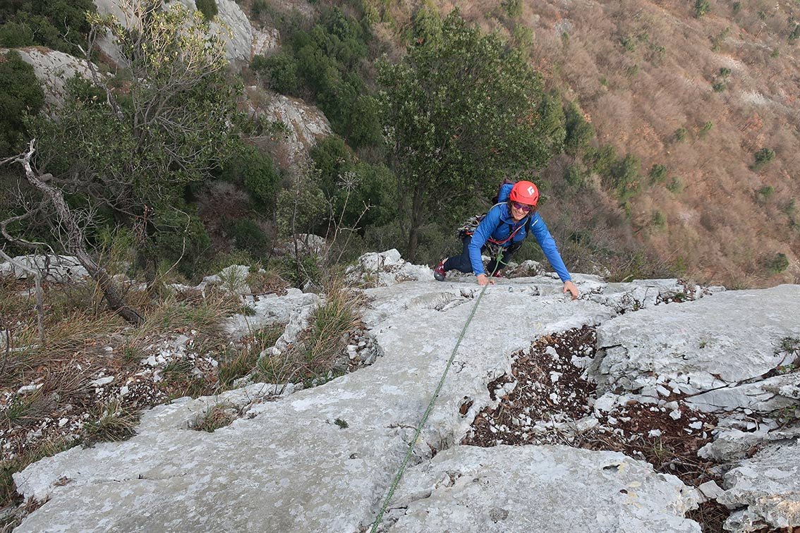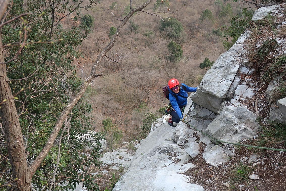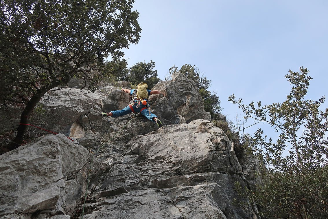 Die letzte Seillänge kann man mit einem Zwischenstand (Baum) auch auf zwei Seillängen aufteilen - in der Regel klettern aber alle in einem Zug bis ganz nach oben.