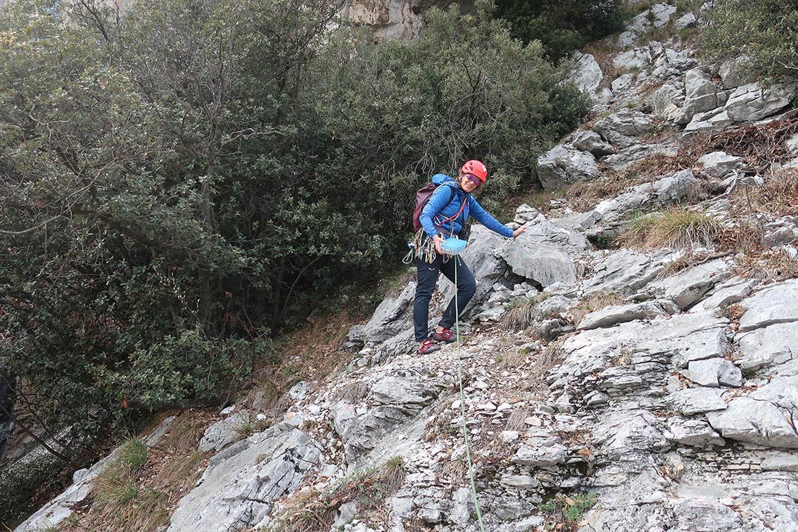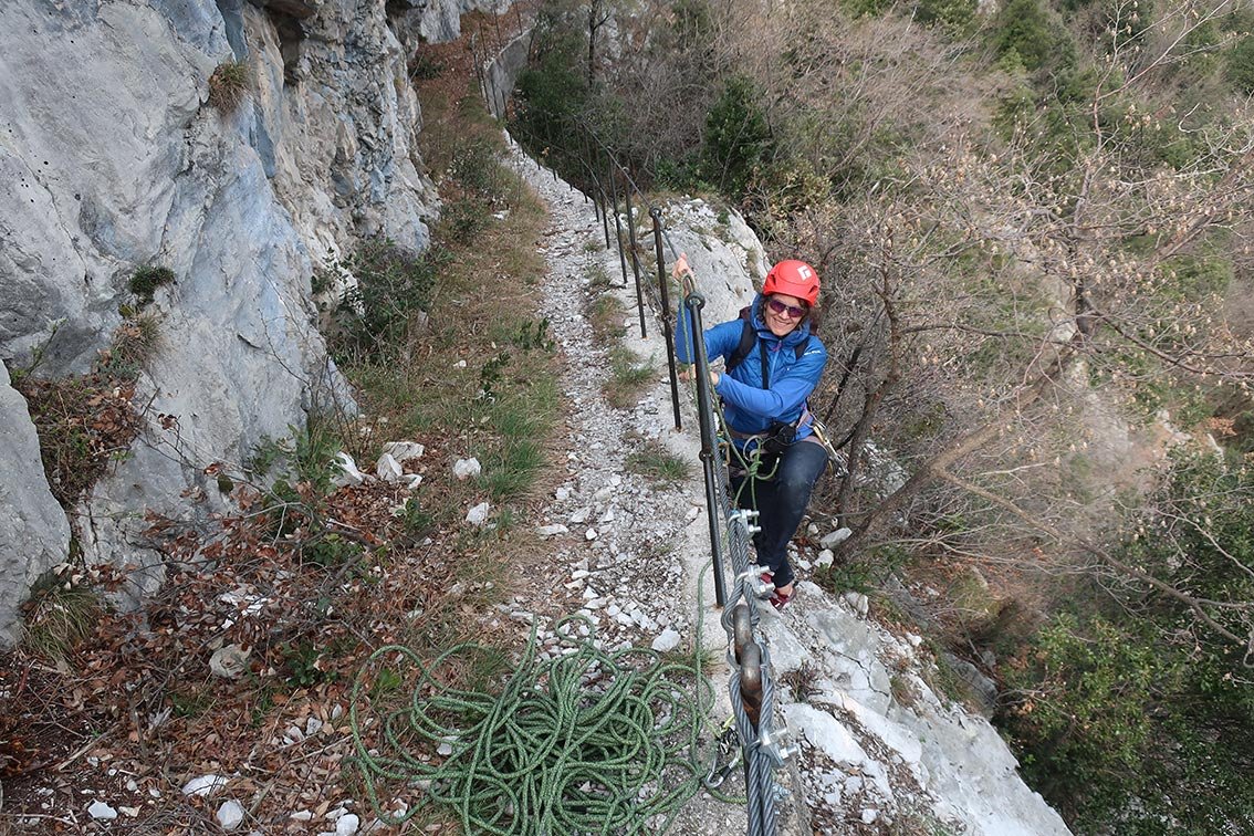 Vom Ausstieg beim Wandbuch (dort geht es auch nach links abwärts zur erwähnten Variante Sonia) aufwärts, man kommt zu einer kurzen Felsstufe, die mithilfe eines Fixseils überwunden wird. Auf dem Pfad kurz aufwärts, bis man auf einen breiten Pfad trifft, auf diesem nach rechts absteigen (kurze Felsstufe ist als einfacher Klettersteig versichert). Unten dann auf dem Weg zurück zum Einstieg und auf dem bekannten Zustiegsweg zum Massenza See absteigen.