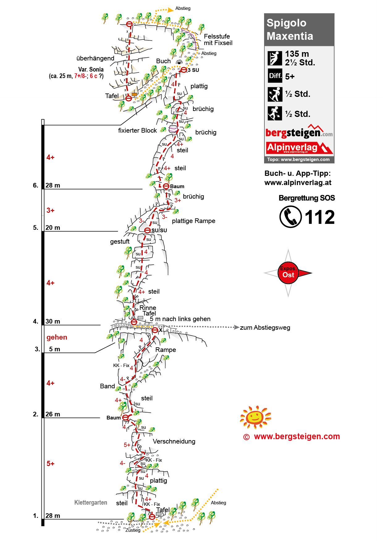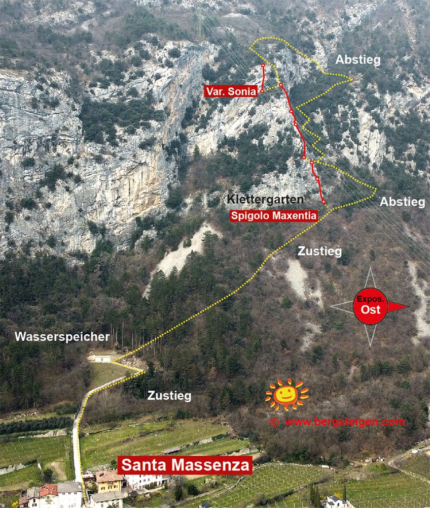 Die Spigolo Maxentia zieht an einer Kante unmittelbar rechts von einem Klettergarten hinauf. Der Anstieg teilt sich in zwei Teile und kann nach den ersten beiden Seillängen (welches auch die besseren sind) nach rechts auf einem Weg verlassen werden. Die Tour beginnt gut, wird nach oben hin aber rustikaler und brüchiger. Nach dem Ende kann man links noch die Variante Sonia anhängen - diese ist mit Bohrhaken gesichert, aber mit ca. 6c (7+/8-) aber deutlich schwerer als die Hauptroute. Wer andere Touren oberhalb des Massenza Sees klettert, kann die Spigolo Maxentia gut als zweite Tour (da direkt am Abstiegsweg gelegen) leicht anhängen.