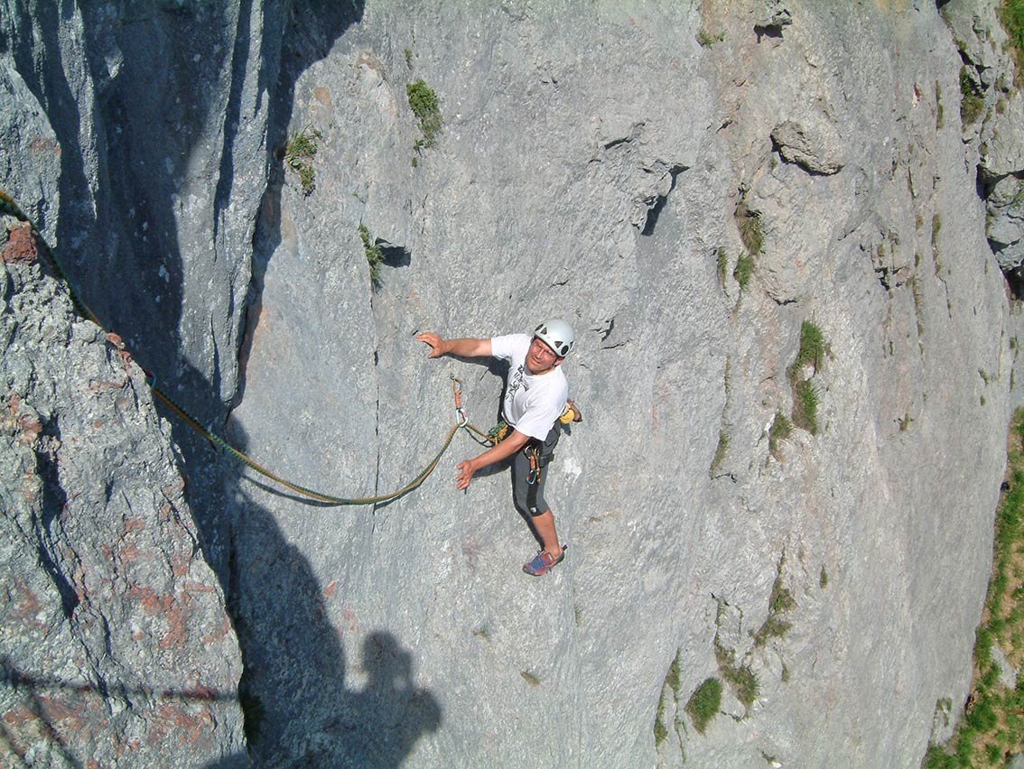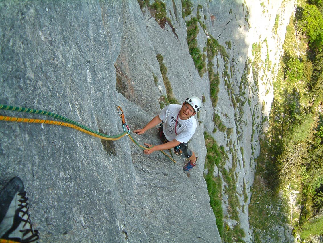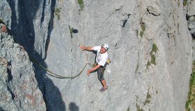 12 Expressschlingen, Helm, Bandschlinge und 60 m Doppelseil.