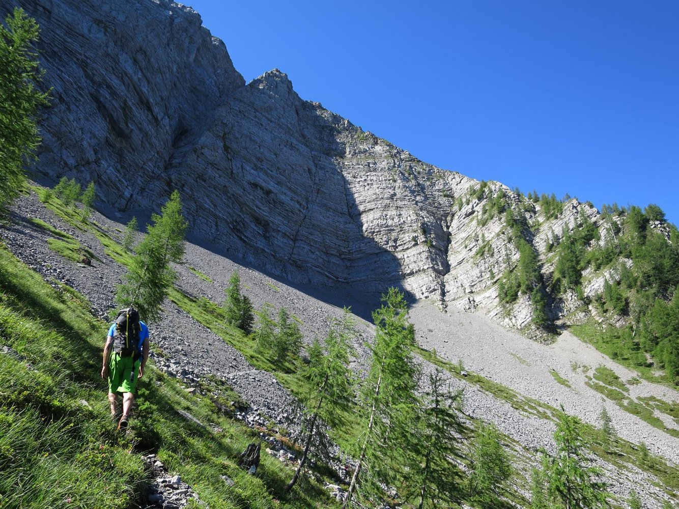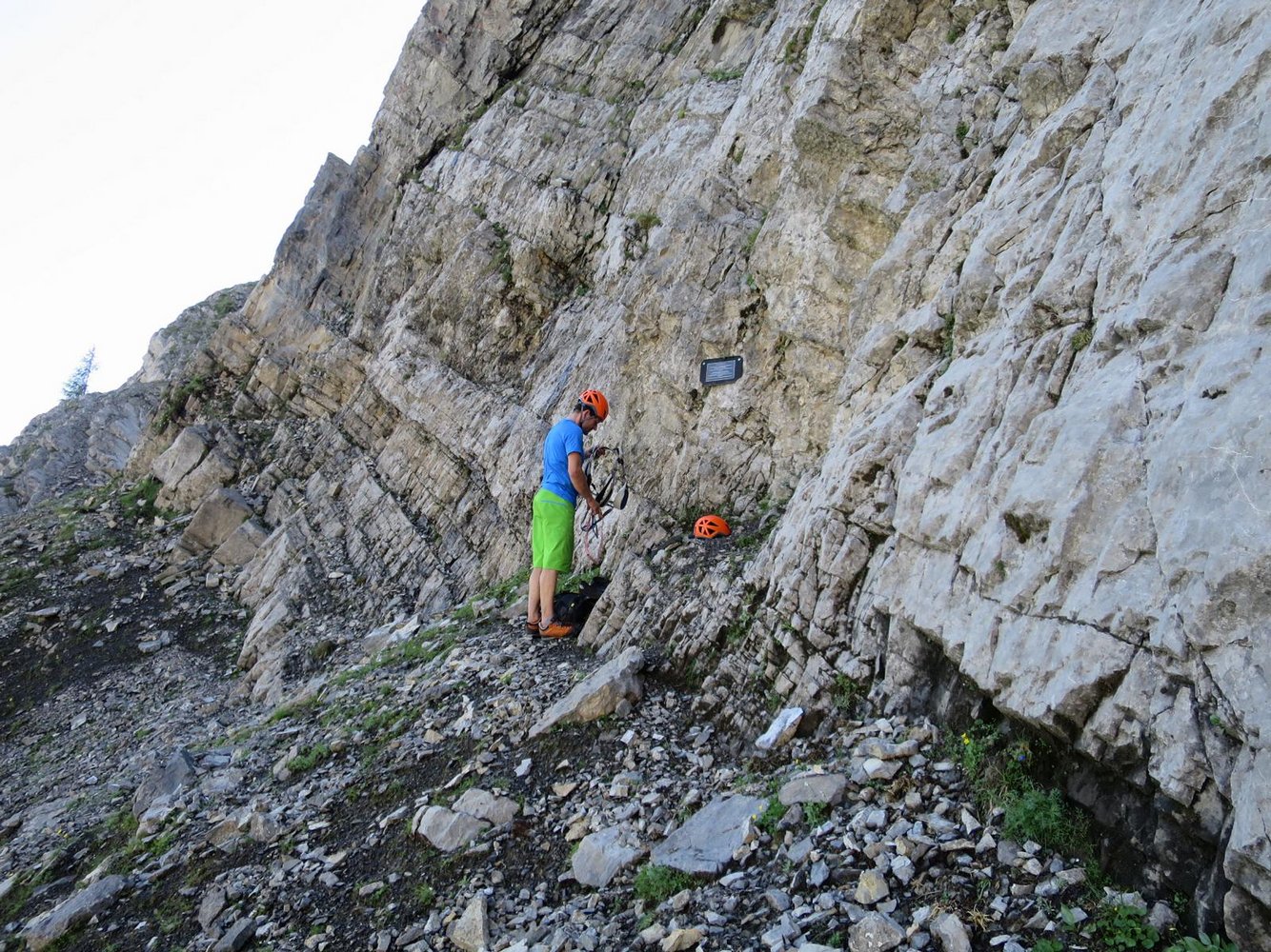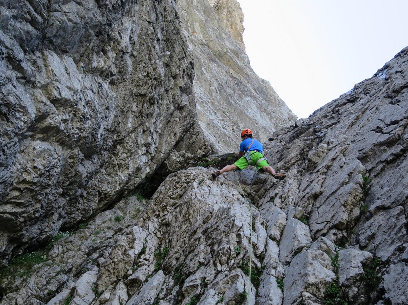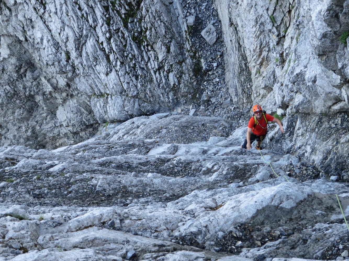 Die Route verläuft nahezu immer rechts vom Kamin bzw. der Rinne in den Platten.