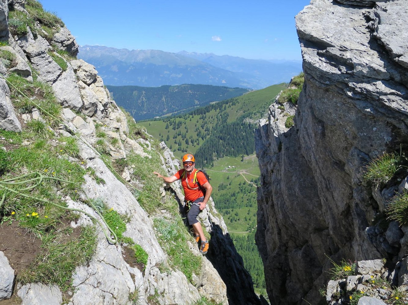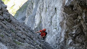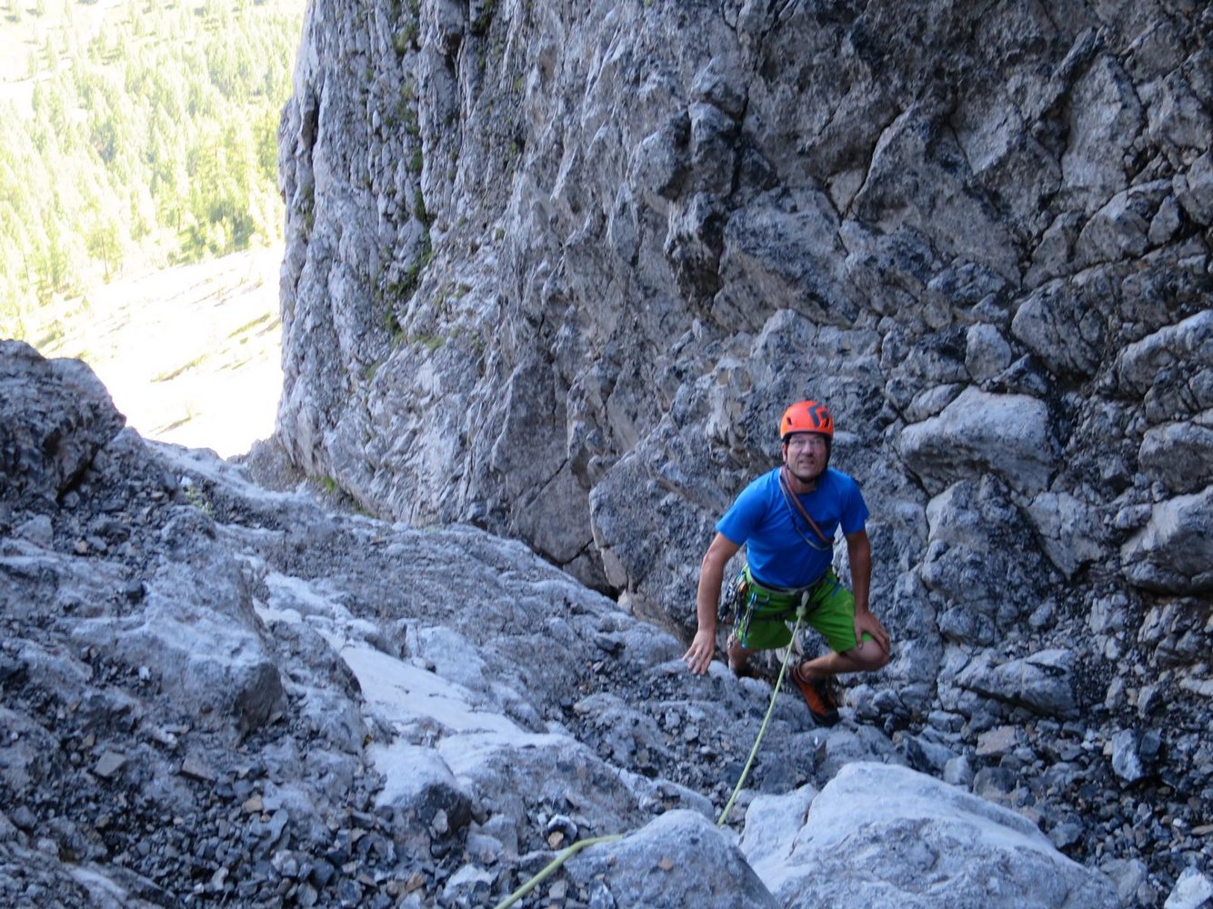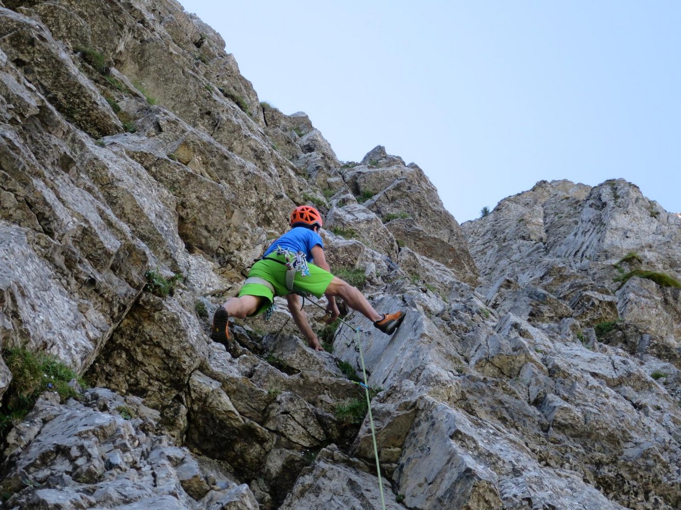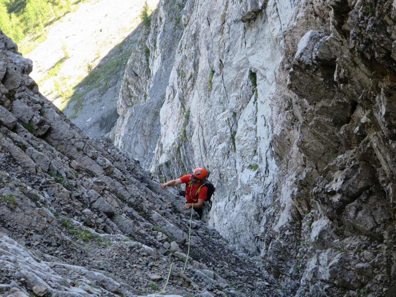 Trotz der vielen Bohrhaken eine Tour mit alpinen Gefahren, wie Schutt auf den Platten und Bändern, brüchiger Fels und Steinschlaggefahr, wenn andere Seilschaften oben Klettern ist es unten gefährlich!. Bei Nässe oder nach Regenfällen unbedingt meiden!