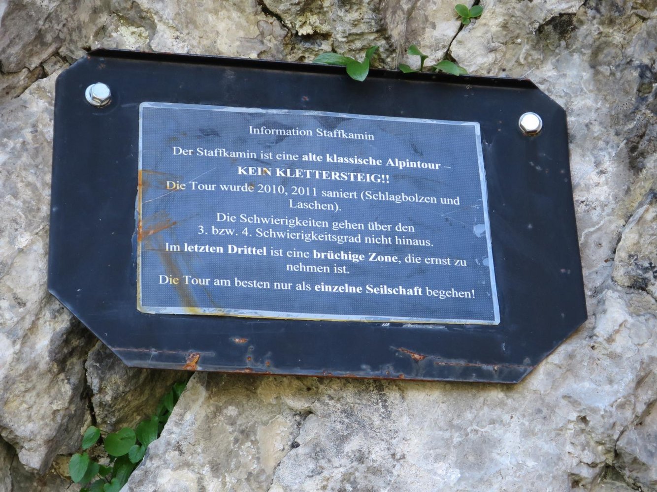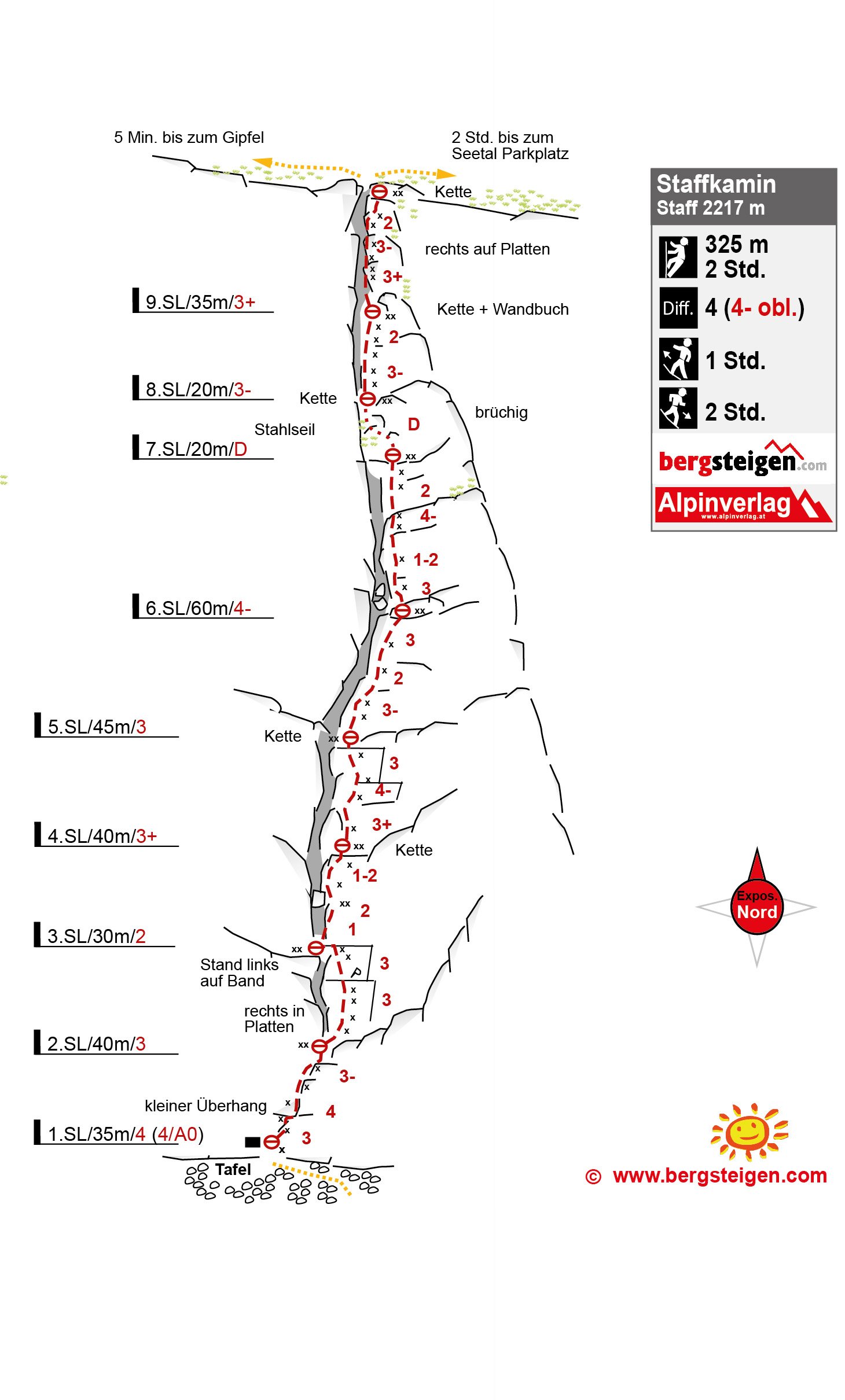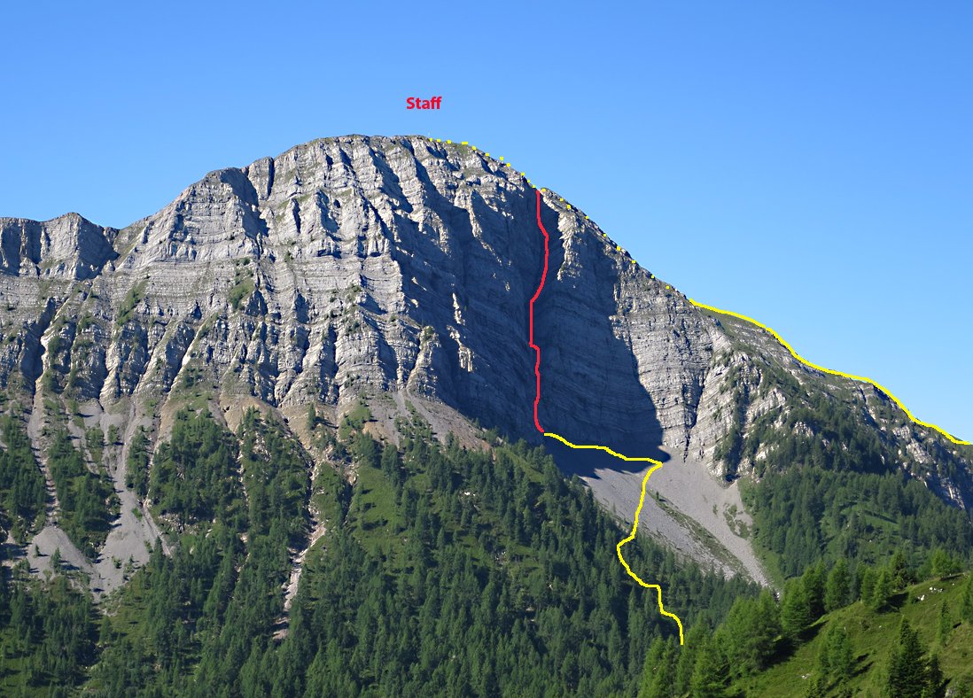 Klassische alpine Linie in nicht immer festem Fels an der Nordwand des Staffs. Die Route wurde 2011 üppig mit Bohrharken ausgestattet. Die sehr gute Absicherung erlaubt weniger erfahreneren Kletterern Alpinluft zu schnuppern. Die brüchigsten 20 Meter wurden mit einem Stahlseil wie ein Klettersteig versichtert. Wegen des auf weiter Streck brüchigen Gesteins ist die Route aber nicht für nur Kletterhallen-Kletterer.