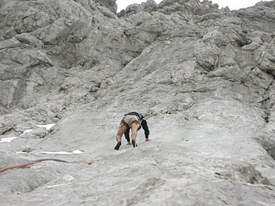 Notausstieg vom Südgrat: Nach dem dritten Turm und noch vor dem Kamin kann man vom Zackengrat bei Standhaken linker Hand über schrofiges Gelände eine Rinne (ca. 1) abklettern.