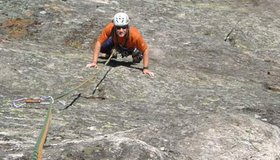 Leider etwas inhomogen, unten eine kurze Passage 5-, oben dann nur noch bis 3+ über glatte Platten, bei denen man nur die Füße braucht. (in der 2ten Länge über Wasserstreifen nach rechts queren)