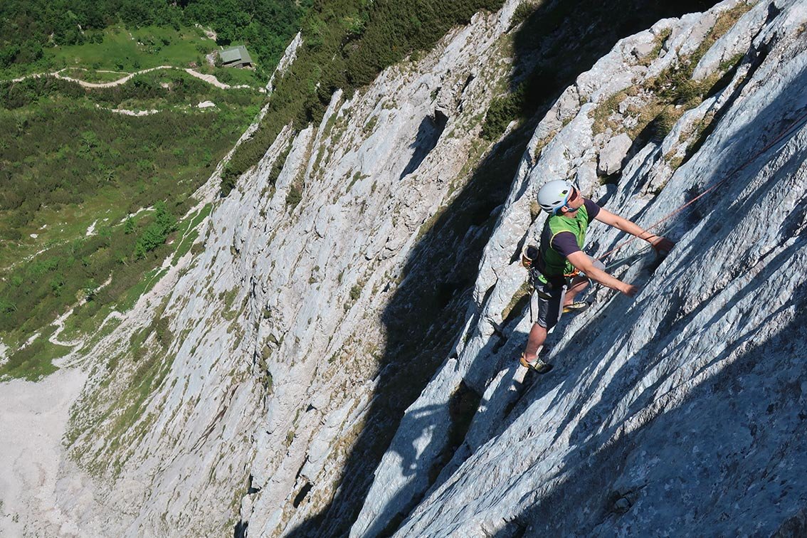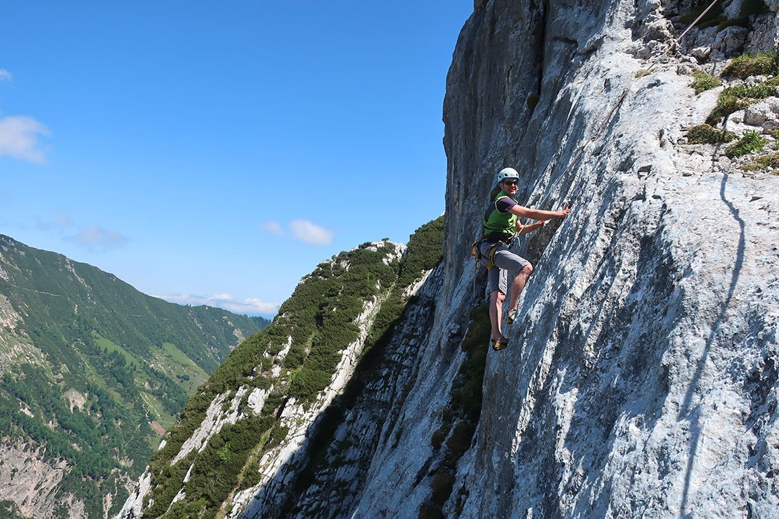 In der Schlüsselseillänge muss man etwas im Wasserstreifen hinauf, dann rechts zu einem Graspolster (dort ist ein alter fixer Klemmkeil), danach kommt die glatte Schlüsselstelle bei zwei Bohrhaken.