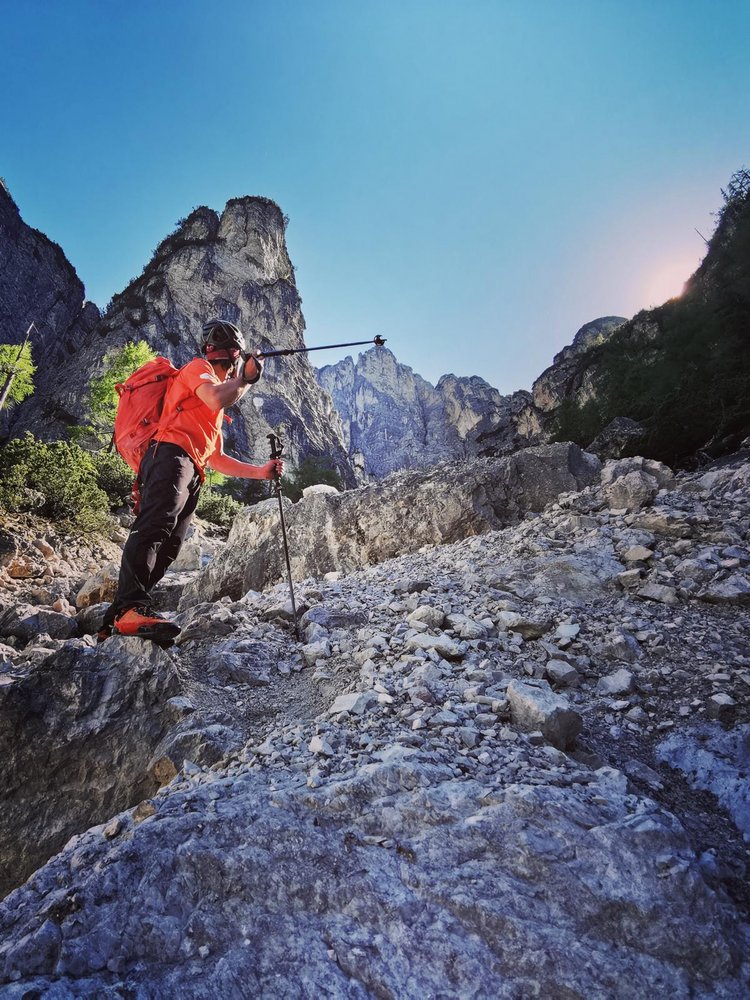 Kurz vor oder direkt bei der Mautstelle Rautal parken. Richtung Norden durch den Wald bis zum seichten Bachbett, dieses queren und nun den steilen gut einsehbaren Geröllgraben hochsteigen. Die Route bzw. Wand ist bereits gut sichtbar. Der Einstieg befindet sich bei einem Steinmann und einer Schlinge (plattiger, grauer und kompakter Wandbereich).
