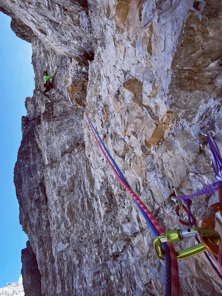 Die Standplätze und Abseilstände sind mit Normalhaken und Schlingen eingerichtet. Sonst wurden keine Haken verwendet. Der Rest erfolgt über mobile Sicherungen an Friends, Klemmekeilen und vereinzelt Sanduhren.