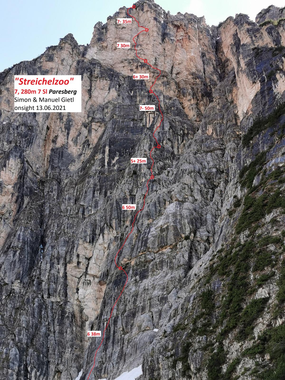 Kurz vor der Mautstelle Rautal ragt auf der orografisch linken Seite ein erstaunlich steiler Pfeiler am Nordfuße des Paresberg in die Höhe. Weder ist derselbe derart schwer einsehbar noch so weit von der Straße entfernt, dass diese Umstände den Plan dort eine Route zu eröffnen, verhindern konnten. Zwei Drittel kompakter grauer Fels und ein steiles Finale im gelben Dolomitgestein garantieren abwechslungsreiches und kurzweiliges alpines Klettern. Simon und Manuel kletterten entlang einer logischen und natürlichen Linie. Das Ergebnis ist eine kühne Route mit klassischem Charakter. Der Fels bietet über weite Strecken erstaunlich gute Qualität und zahlreiche Möglichkeiten sich im Legen von mobilen Sicherungsmitteln zu betätigen. Wenn jemand das abenteuerliche alpine Klettern an abgeschiedenen Felsen frönt, wird er an dieser Wand und der Route "Streichelzoo" sehr großen Gefallen finden. Wer die Einsamkeit sucht, die Abgeschiedenheit wertschätzt und das Abenteuer nicht scheut, findet am steilen, dem Paresberg vorgelagerten Felsenpfeiler genau das passende Betätigungsfeld.