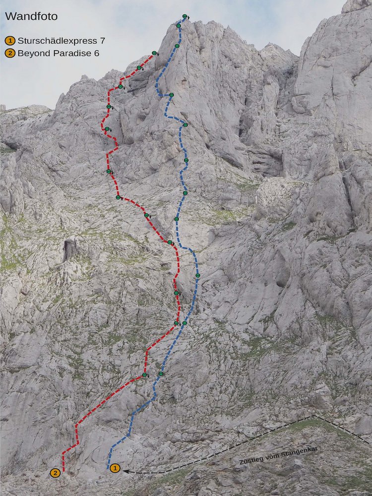 Von Seewiesen Richtung Voisthalerhütte/Hochschwab, nach der Florlhütte zweigt auf einer flachen Wiese (Kühboden) rechts ein Steiglein ab (blasse rote Markierung, dort wo der Wald erstmals wieder weit in die Wiese reicht), nach dem Wald kommt ein sehr kleines Schotterfeld hier nach rechts in die Ausläufer des Stangenkars. Dem Kar immer am linken Rand einer markanten Rinne bis unmittelbar zum Wandfuß folgen, erst fast am Ende nach links queren. Weiter direkt am Wandfuß zu den Einstiegen. Die Einstiege befinden sich in Kletterrichtung rechts der großen Plattenwand und rechts einer Einseillängenroute, der Sturschädlexpress beginnt unter der kleinen kompakten Plattenwand.