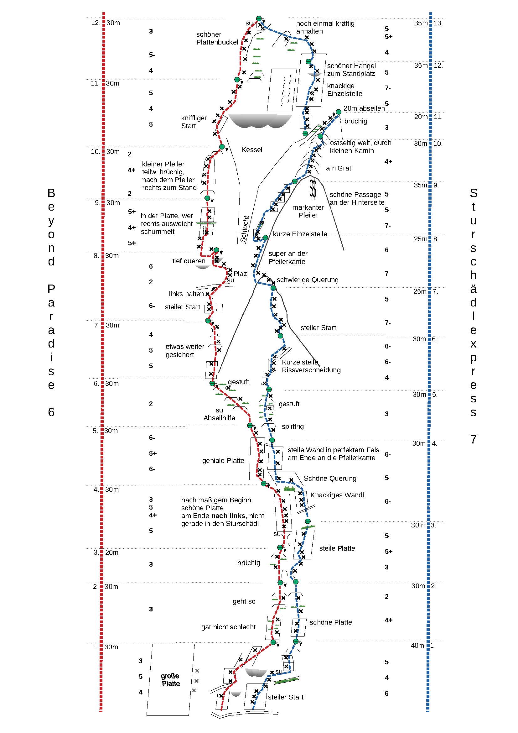 Vom letzten Stand kann man 12 x 30 m über die Route Beyond Paradise abseilen. Abgeseilt sollte aber nur im Notfall werden und nicht, wenn darunter andere klettern.