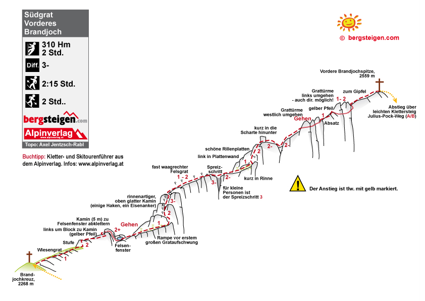 Zuerst auf dem Wiesengrat (1) zu einer Stufe (2), danach erreicht man eine Ecke wo man links den Einstieg zum kurzen Kamin erreicht (gelber Pfeil). Den Kamin 4 m abklettern (2+), vorbei am Felsenfenstern weiter zu einer Rampe (Gehen und 1, oft wird am Ende der Rampe angeseilt). Dort weiter aufwärts, in einen rinnenartigen, glatten Kamin (3-, Schlüsselstelle). Danach erreicht man wieder den Grat (1 - 2), dem man bis zum Spreizschritt (3-) folgt. Nach dem Spreizschritt in eine Rinne (1), dann aber links haltend auf schönen Platten (2) hinauf zu Grat mit einem mark. Block. Kurz in eine Scharte abklettern (2-) dann umgeht man die folgenden Grattürme westlich, nach einem Gratstück (1) erreicht man einen Absatz. Dort zeigt ein Pfeil nach links zur Umgehung des Aufschwunges (1 - 2: auch direkte Überkletterung ist möglich). Danach über Schrofen hinauf zum Gipfel der Vorderen Brandjochspitze.